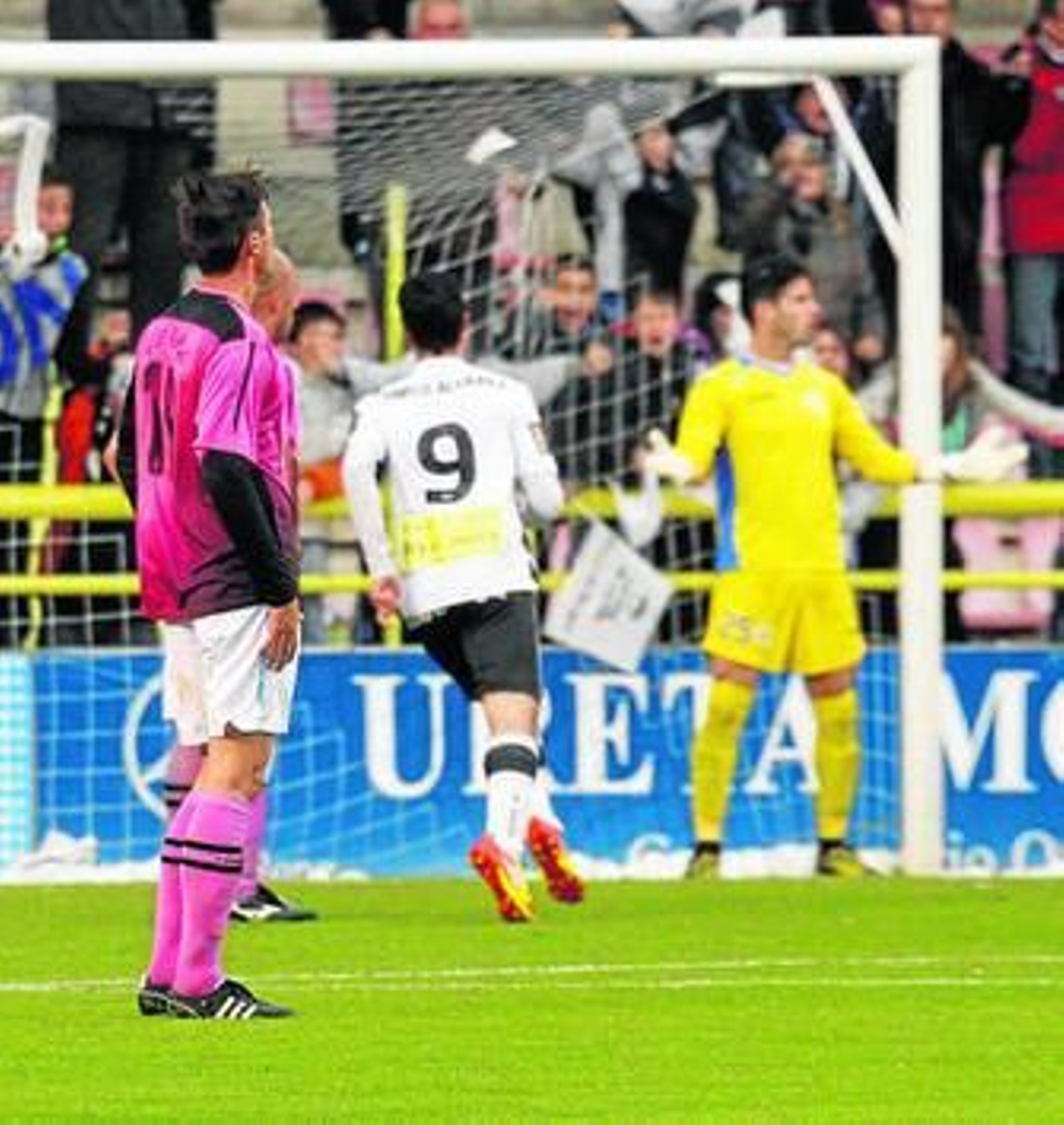 Y eso que las cosas pintaban muy felices para el Burgos con el tempranero gol de Carralero. El delantero gaditano anotó su 26 tanto de la temporada a los 8 minutos de partido, un mazazo del que costó sobreponerse el cuadro malagueño. Con el paso de los minutos, Francis Flores y Gerrit comenzaron a tener más influencia en el duelo y las ocasiones empezaron a cambiar de área. Aurreko asumía el reto de frenar las acometidas paleñas tal y como hiciera en San Ignacio. Pero esta vez no tuvo tanta estrella. Loren se convirtió en mero espectador durante buena parte de la primera parte y el miedo empezaba a palparse en las gradas. Un tanto daba el ascenso virtual a los de Dani Pérez, aunque el descanso desató la tranquilidad.
