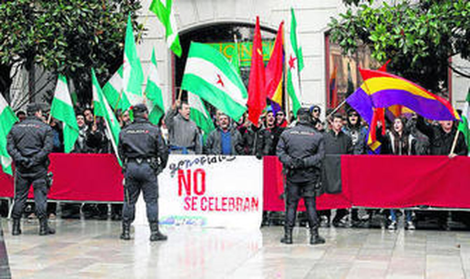 Cordón policial separando a los dos bandos, banderas al aire y acción para el 524 aniversario de la Toma. Todo estaba preparado desde primera hora de la mañana en la plaza del Ayuntamiento para acoger a los miles de asistentes que se congregan, aunque la presencia de público ayer fue algo más baja que en ediciones anteriores. Al lado izquierdo del balcón del Ayuntamiento, se situó de nuevo el grupo AntiToma con representantes de plataformas como Nación Andaluza que ondearon estandartes republicanos, comunistas, anarquistas y, sobre todo, de corte nacionalista andaluz. Con silbatos para boicotear los himnos y las marchas militares y una pancarta que rezaba "los genocidios no se celebran" rivalizaron con el grupo de los que estaban en frente de la fachada de la Casa Consistorial, los pertenecientes a grupos de extrema derecha.