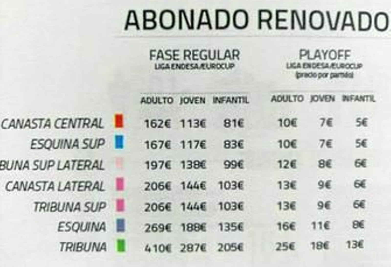 Los 25 partidos de temporada regular (17 de la Liga Endesa más cinco de la primera fase de la Eurocup más los tres del hipotético Top 16) tienen precios que irán, para adultos, desde los 162 en Canasta Central hasta los 410 euros de Tribuna. Después, cada partido de play off, indiferentemente de la ACB o la Liga Endesa, sumará de 10 a 25 euros más. Para jóvenes (de 15 a 30 años) van de 113 a 287 euros y para infantiles (hasta 14 años), de 81 a 205.