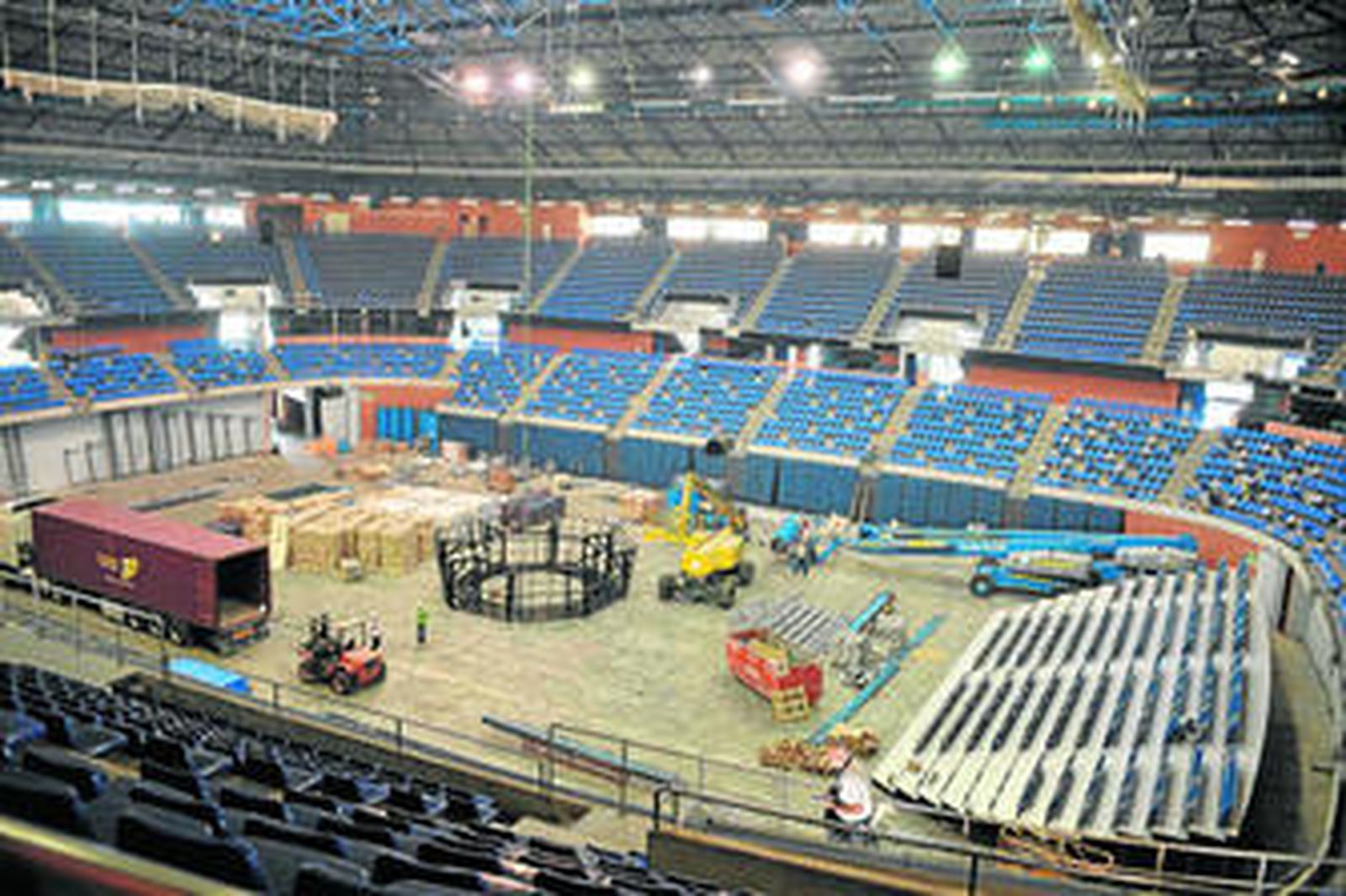 Gradas, parqué y videomarcador son las tres patas en las que se asienta la reforma. Las gradas se ampliarán oficialmente a 10.823 plazas, 11.000 con las sillas a pie de pista que se colocan durante los partidos del Unicaja. El nuevo graderío telescópico desmontable en las esquinas suma 1.115 asientos más. En uno de los fondos ya están instaladas las gradas. Las sillas son más modernas y cómodas y hay un matiz cromático nuevo. El clásico azul uniforme de todas ellas desaparece. Se alternarán con butacas grises por todo el pabellón, en un efecto estético. Cuando no haya un lleno habrá menos sensación visual de vacío.