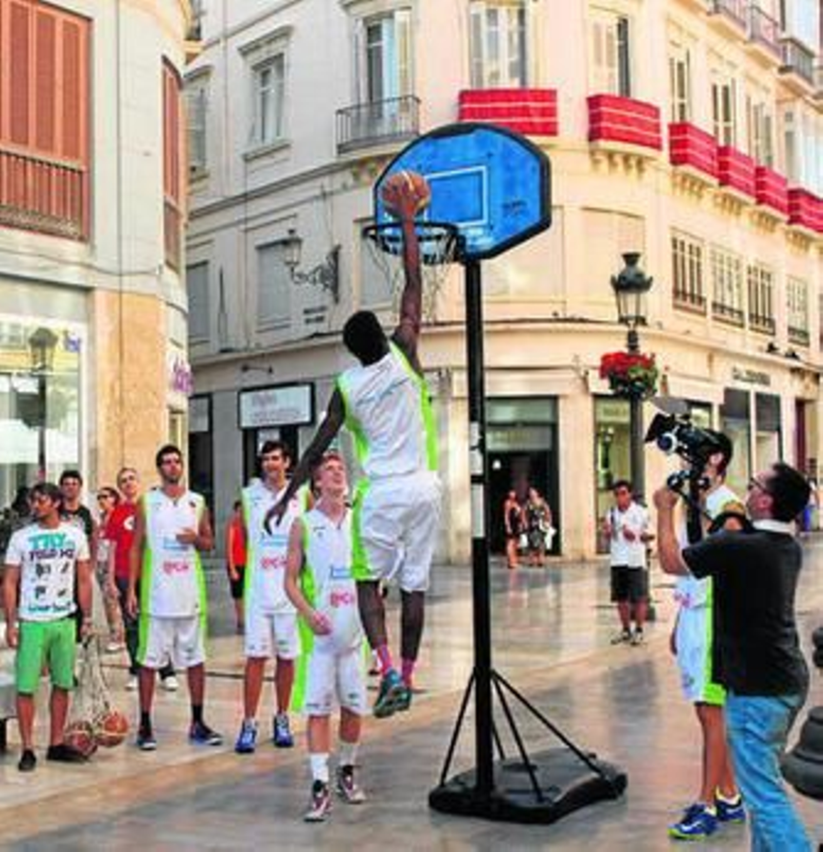El equipo malagueño de la LEB Oro rodó ayer un anuncio para su campaña de abonados en el corazón de la ciudad Los jugadores disputaron partidos con los curiosos que se acercaron