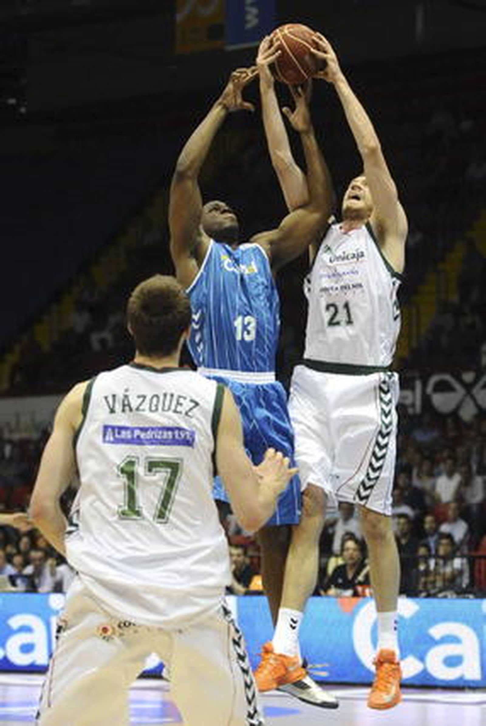 Un mate de Latavious Williams casi sobre la bocina del primer tiempo dejaba la diferencia por debajo de los 10 puntos (32-41), aunque con la sensación de que el Unicaja tenía el partido en la mano, de que ganara o perdiera la responsabilidad era completamente suya, de la capacidad que tuviera para manejar su superioridad. En esa línea continuó el partido, con neta claridad para el Unicaja, que martilleaba el aro con mates. El Cajasol intentaba subir las líneas de pase, pero dejaba espacios que el equipo de Repesa solventaba con buenas circulaciones para encontrar red. Del Cajasol apenas algún destello luminoso de Satoransky, con una penetración culminada con un mate a dos manos. Pero se espera más del joven checo. El Unicaja se distanciaba ladrillo a ladrillo. La defensa era de alto nivel, el Cajasol estuvo seis minutos en los que apenas anotó un triple de Sastre. Y, tras cinco puntos consecutivos de Calloway, la diferencia se expandía hasta los 15 tantos (44-59).