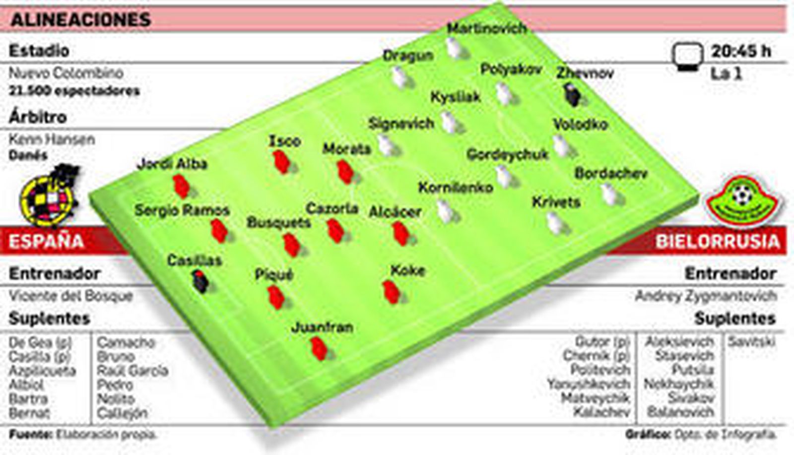 El gol fue uno de los principales problemas España en el Mundial de Brasil y en los primeros partidos de clasificación a la Eurocopa. Y Del Bosque prueba fichas para ver cuál le encaja mejor. En las otras dos líneas, las apuestas del entrenador español han sido menos innovadoras y todo apunta a que Busquets, Koke y Cazorla volverán a formar frente a los bielorrusos, junto a Isco, cuyas últimas actuaciones con el Real Madrid le revalorizan.