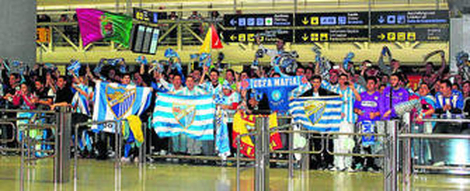 Alguno que otro enciende el móvil antes de que se abran las puertas del avión, trasciende que hay más de 300 malaguistas esperando a sus héroes. Flota el recuerdo de Atenas, aquella recepción a una hora parecida tras conquistar el infierno del AEK, Manu subido a hombros de un aficionado. Pancartas de "UEFA Mafia", "Sí pudimos, no quisieron". Los cánticos de siempre. Tras el paso previo para recoger el equipaje, muchos de ellos consolados por los familiares que iban con ellos en el chárter, llega el ruido de fuera. Salen por grupos y a cuentagotas. Joaquín es abrazado por todos, le cuesta la misma vida mantener la compostura y no romper a llorar. Manuel Pellegrini se para, sonríe, saluda a los presentes. Se oye su cántico de rigor. Alguno está sobrepasado, no lo espera. Cousillas sigue humedeciendo su rostro imperturbable. A Husillos, que lo ha vivido todo en el Málaga, se le cae toda la pose que había aguantado hasta el momento. Llora sin consuelo. A otros dirigentes no hay quien les quite el enfado, Francisco Martín Aguilar se abraza con algunos aficionados y les da las gracias. Fotos, ánimos, vítores; la afición blanquiazul da una lección de saber perder, premia la trayectoria y el legendario paso por la Liga de Campeones. Santa Cruz, el rezagado, es el último en atravesar la riada de brazos. En pocos minutos se dispersa la expedición y los seguidores. Algunos se van a dormir, otros enlazan con la entrada al trabajo. El último recuerdo de una madrugada inolvidable endulza de algún modo el cruel final. Es el adiós que se merece un equipo épico.