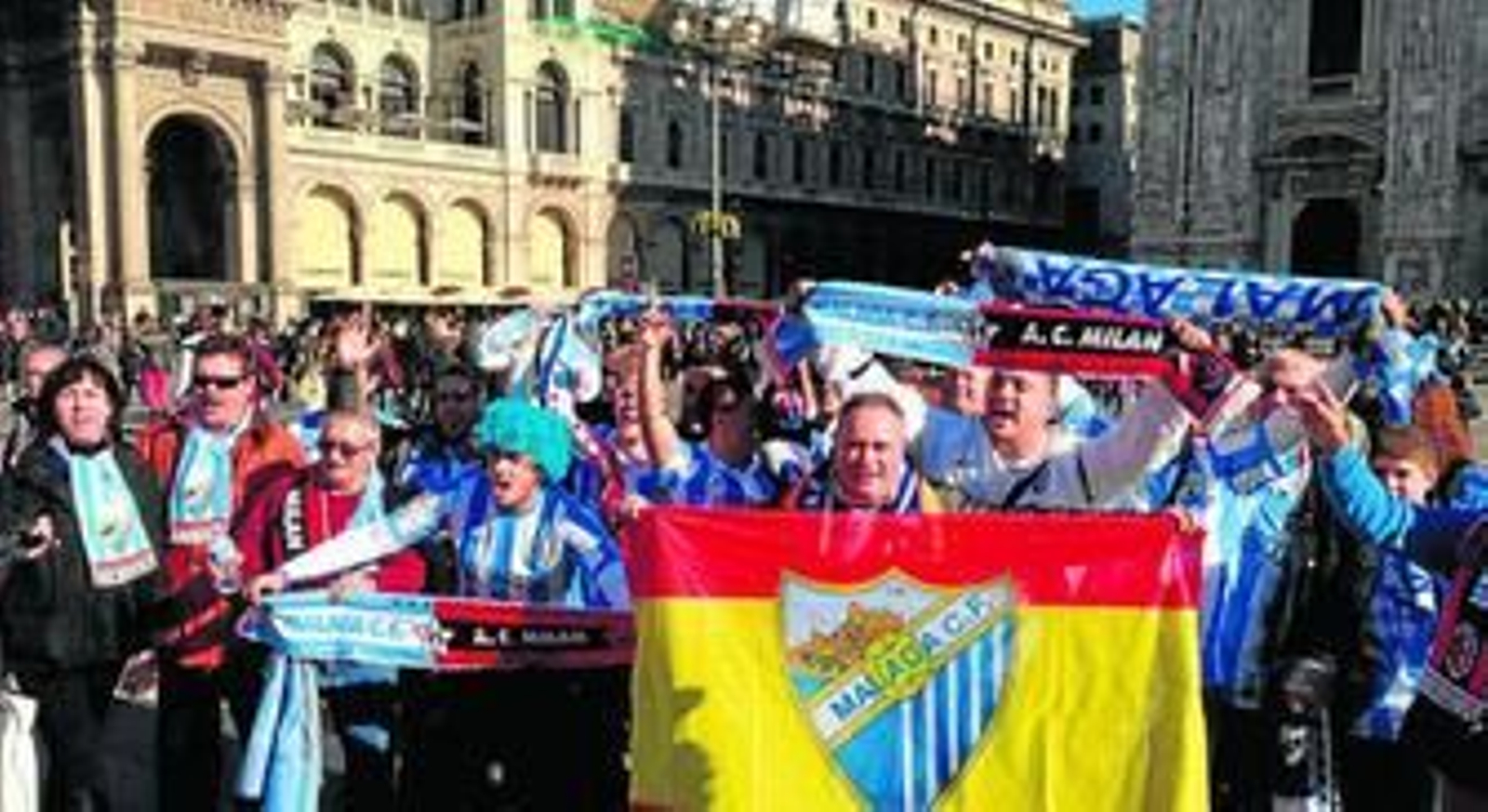 Durante el partido se escuchó desde el "árbitro, qué malo eres", para increpar la laxitud de Webb, hasta sones del "Málaga, la bombonera". Este último fue el hilo conductor de las diferentes quedadas en el Duomo, el corazón de Milán. Por allí se pasaron en algún u otro momento los malaguistas desplazados y llegados vía Valencia, Madrid, donde se cruzaron los hinchas del Borussia Dortmund y se desearon suerte, o Barcelona en combinaciones ciertamente diabólicas. El centro de Milán, esas lujosas galerías alrededor del núcleo de la capital financiera de Italia, se vio invadido por banderas blanquiazules. Pero siempre en son de paz, sin incidentes. Pudo llegar todo malaguista con vuelos concertados y se compensará a los que el lunes sufrieron un retraso de varias horas en Málaga para poner un pie en Italia. Pero estuvieron allí y consiguieron ver a su equipo empatar en la casa del heptacampeón de Europa, soñando despiertos de 2.000 formas distintas.