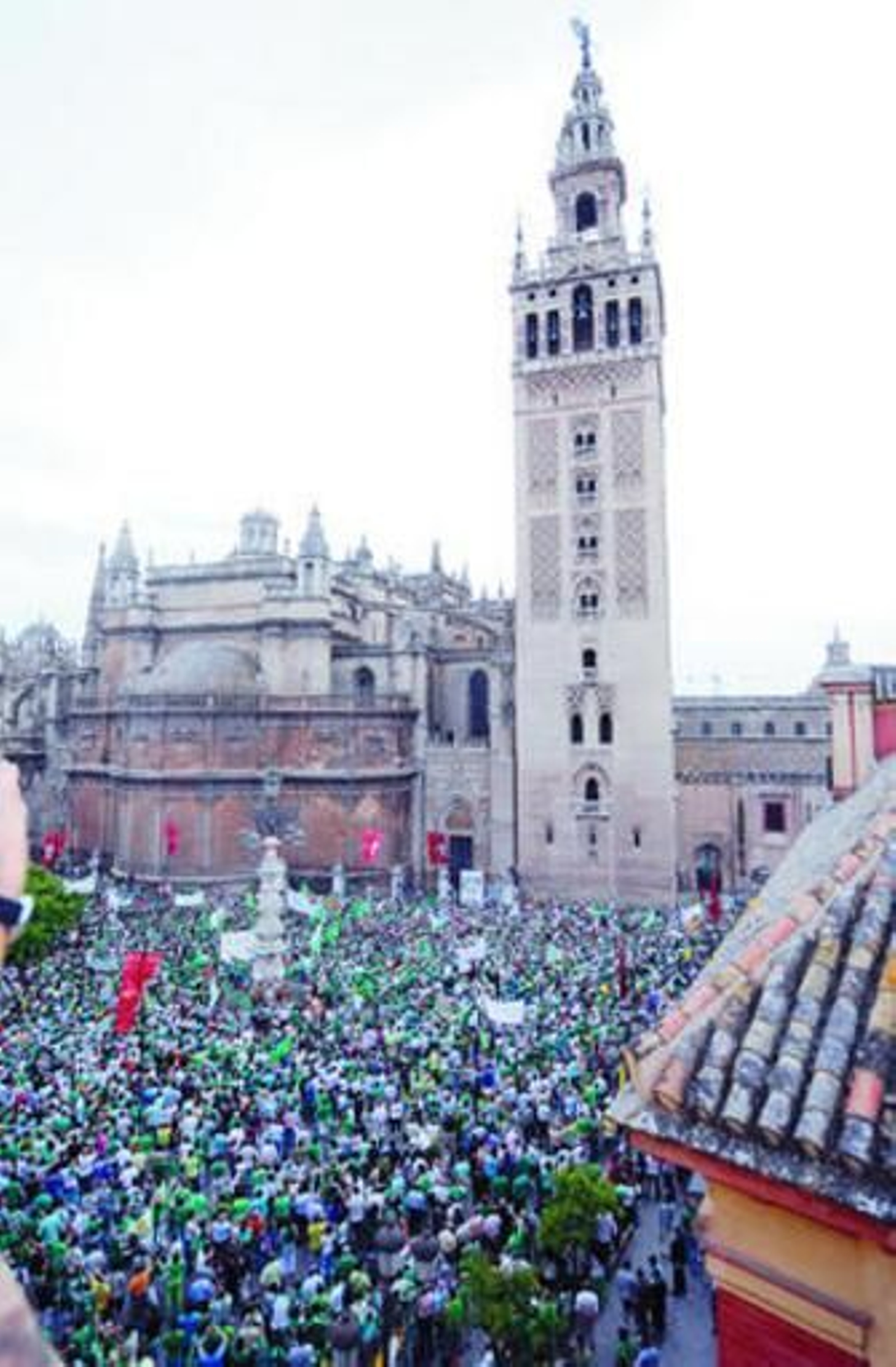 "Vine a defender al Real Betis Balompié que todos queremos y al que algunos defendimos desde los 13 años", dice Quino, recién llegado de esa Cádiz que divide su alma en dos y que hacía un esfuerzo, como el resto de la cabecera de la manifestación, por alcanzar el punto cero en una Plaza Virgen de los Reyes en la que no cabía ni el más privilegiado de sus vecinos, el Giraldillo. ¡Cuánto Betis en la atardecida más bética que se recuerda!