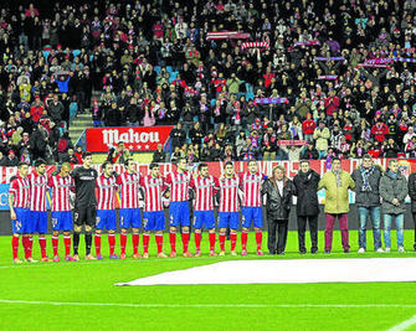 Un grupo de veteranos del equipo rojiblanco portaron por el terreno de juego una lona gigante con la efigie de la camiseta de Luis, con el número 8 a la espalda, mientras desde la grada se entonaba el "Luis Aragonés, Luis Aragonés, Luis Aragonés, Luis Aragonés". El grupo de veteranos, compuesto por Adelardo, Calleja, Capón, Gárate, Melo, Pepe Navarro, Abel, Rivilla, San Román, Rodri, Armando Ufarte, Aguilera, Santi Denia, Roberto Fresnedoso y Quique Ramos, tumbó la lona en un lateral del césped y en medio de un estremecedor silencio se proyectó un vídeo desde los marcadores con imágenes de Aragonés, tanto de su etapa de jugador, como de entrenador. A continuación, se guardó un minuto silencio antes del partido.
