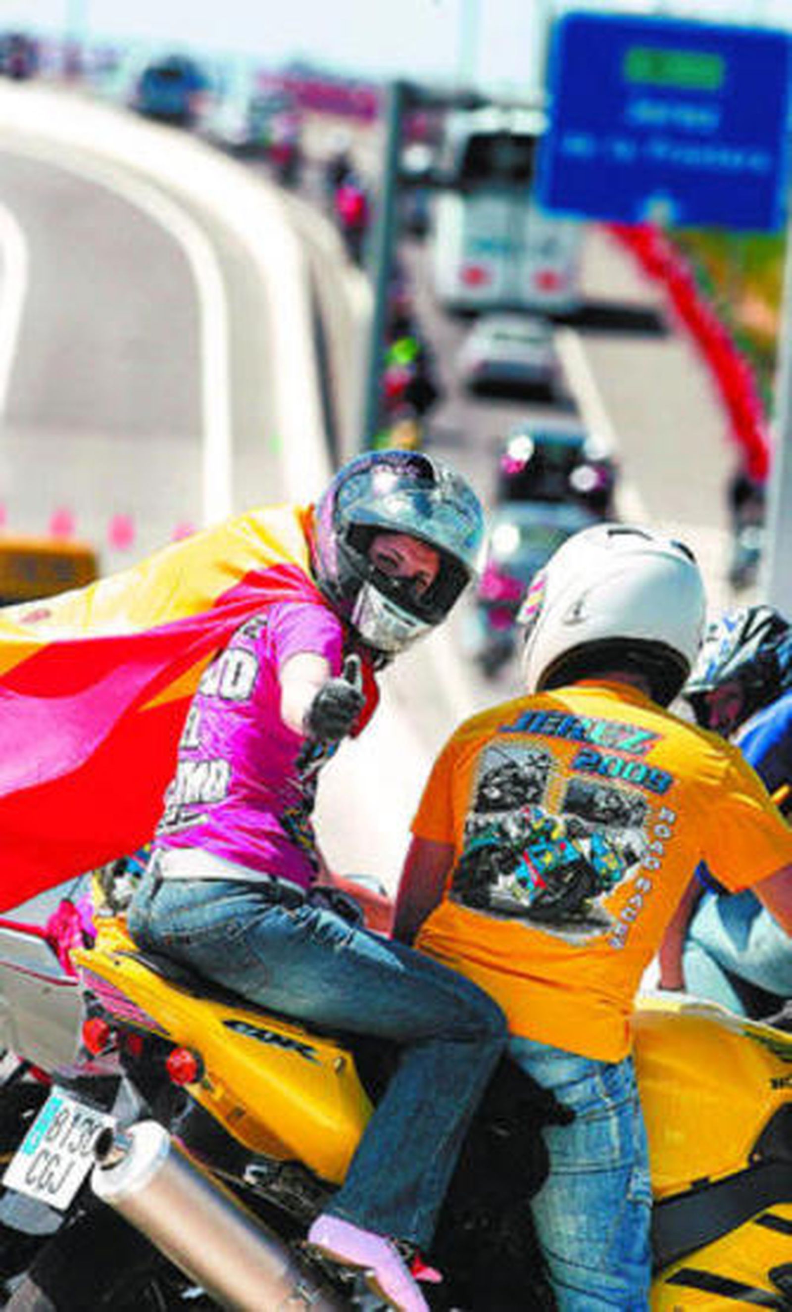 l Las motos han sido una de las protagonistas de un intenso fin de semana iniciado el viernes con la festivida del Primero de Mayo. La avalancha ha sido especialmente evidente en Jerez de la Frontera y El Puerto, aunque menos en otras localidades turísticas de la provincia gaditana. Una fiesta a la que se han sumado un buen número de aficionados de la comarca del Campo de Gibraltar que, tras finalizar el Gran Premio, regresaron por la A-381 y la N-340.