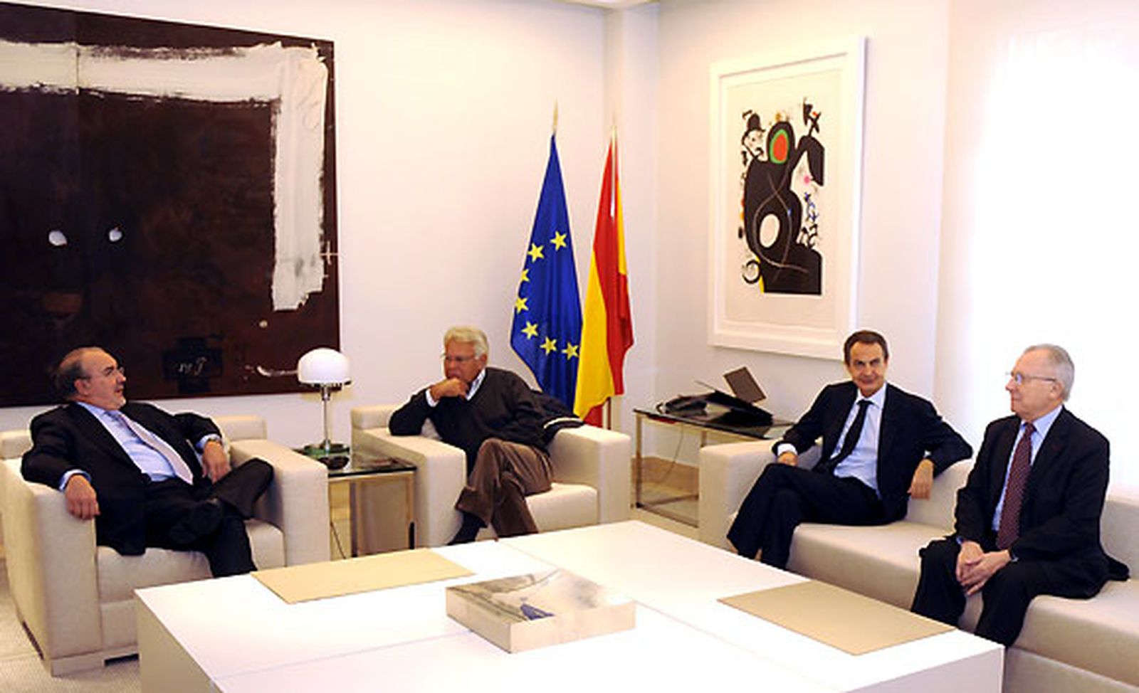 Zapatero ha reunido en el Palacio de la Moncloa al ex presidente del Gobierno Felipe González, al ex presidente de la Comisión Europea Jacques Delors, al ex comisario europeo y ex vicepresidente económico Pedro Solbes y a su vicepresidenta segunda y ministra de Economía, Elena Salgado.