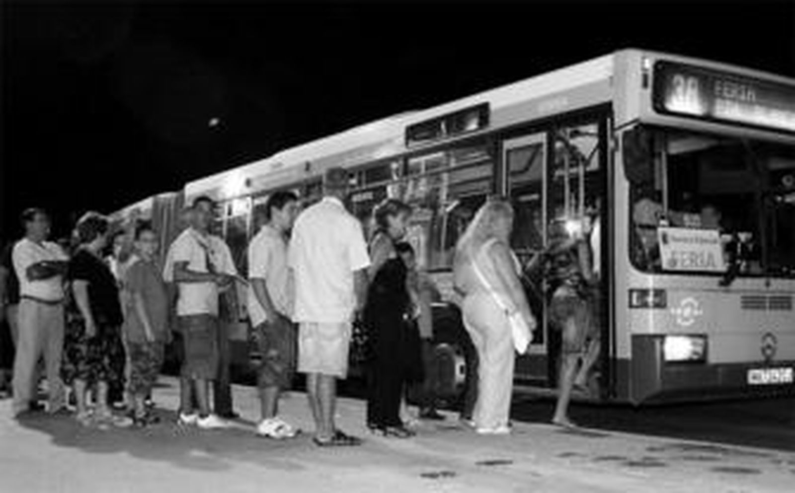 La noche empieza en las colas, interminables a cualquier hora. En ellas las conversaciones sirven como preludio que lo que se pretende vivir. Impuntualidad, primeras citas, embriaguez previsibles y por supuesto, la multitud que pretende trasladarse, son muchos de los temas que se pueden escuchar en un rato de espera. Desde El Palo hasta el recinto ferial, la línea especial creada ex profeso para la Feria va recogiendo pasajeros que inician el viaje cargados de energía y ganas de pasarlo bien. Todo sirve para, una vez subidos en los concurridos vehículos, celebrar de muchas maneras la llegada nocturna al Cortijo de Torres, como un trofeo. Volviendo a edades pasadas, muchos usuarios optan por canciones infantiles para amenizar el trayecto. Igual que en las excursiones de antaño.