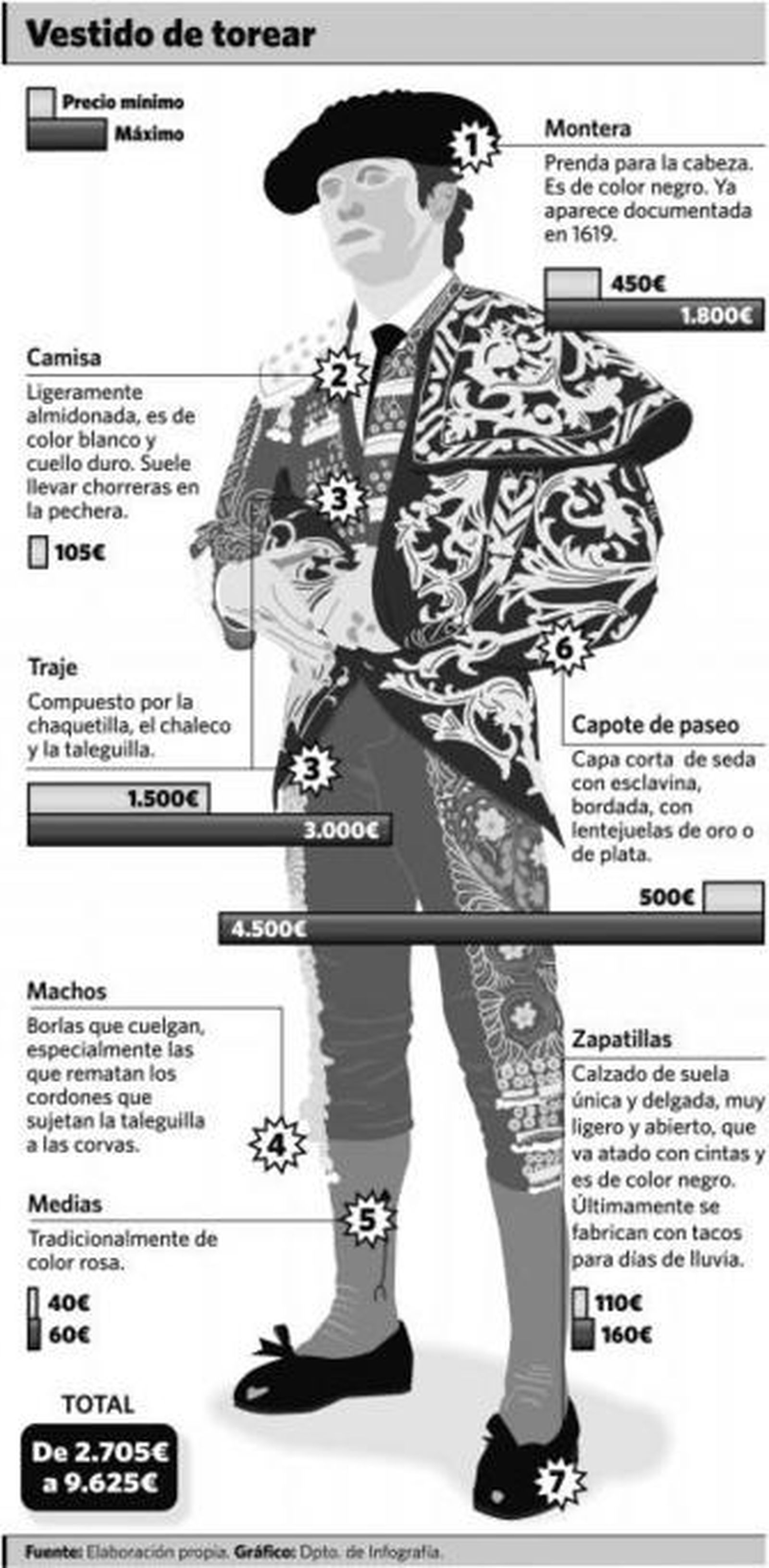 Una de las características fundamentales del vestido de torear es su riqueza cromática. Y otra, apenas conocida por los profanos, su gran incomodidad. Según toreros consultados, con éste atuendo de unos cinco kilos, tanto el calor como el frío se acentúan al máximo, aunque "debido al miedo que paso, no me doy cuenta de ello"; afirma un banderillero. Lo que está claro es que en la evolución de esta segunda piel del torero comprobamos cómo se ha ido pasando de un atuendo que era una simple coraza a un traje de luces que es una auténtica obra de arte.