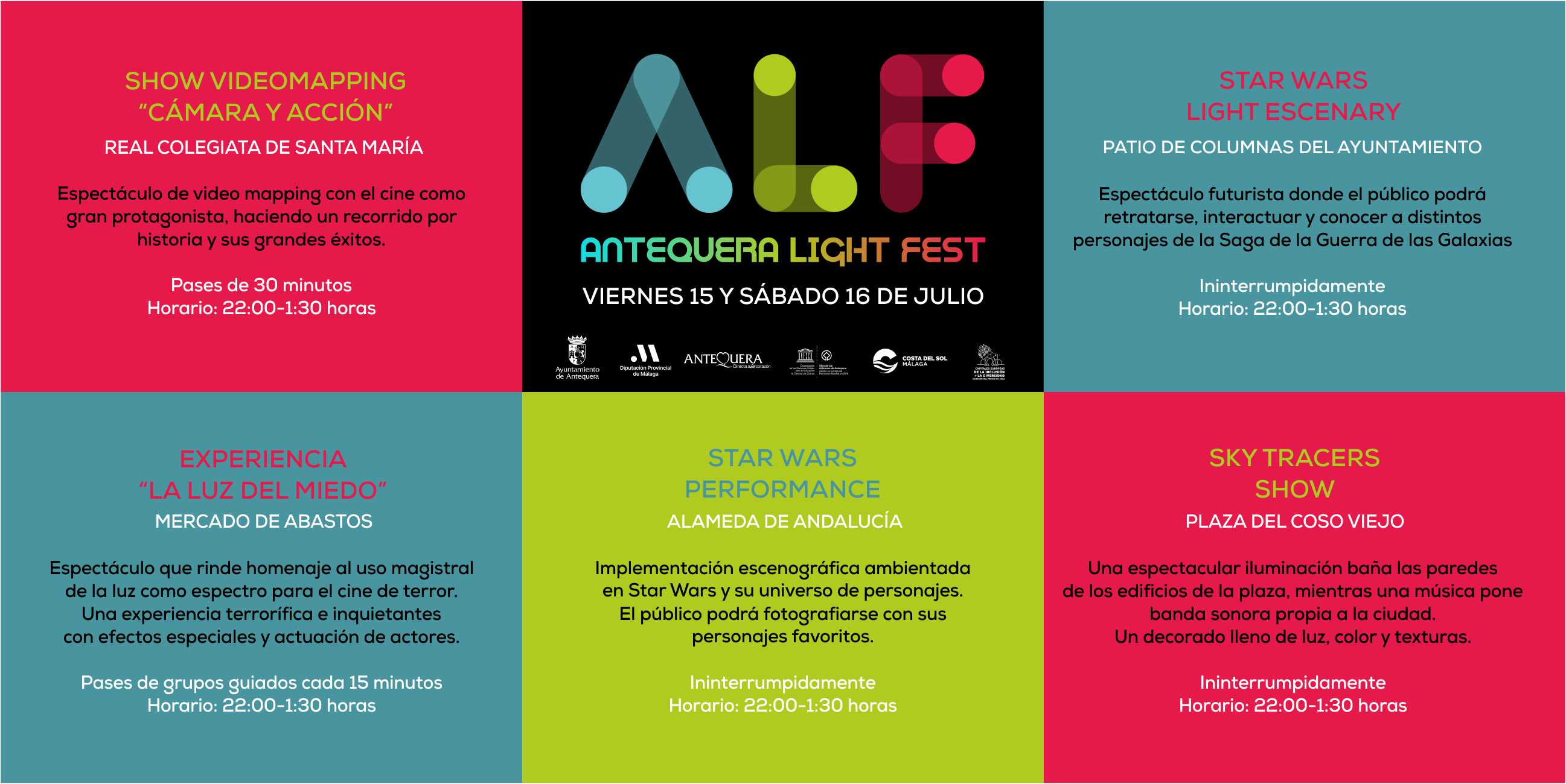 Antequera Light Fest: Es un festival de luz muy particular, la localidad antequerana se transforma en un espectáculo de luz y monumentos a partir de las 22:00 horas, momento en el que varias localizaciones simbólicas del municipio tienen preparados shows que se adentrarán en las primeras horas de la madrugada, una buena opción contra el calor. Lo mejor es consultar su programa completo.