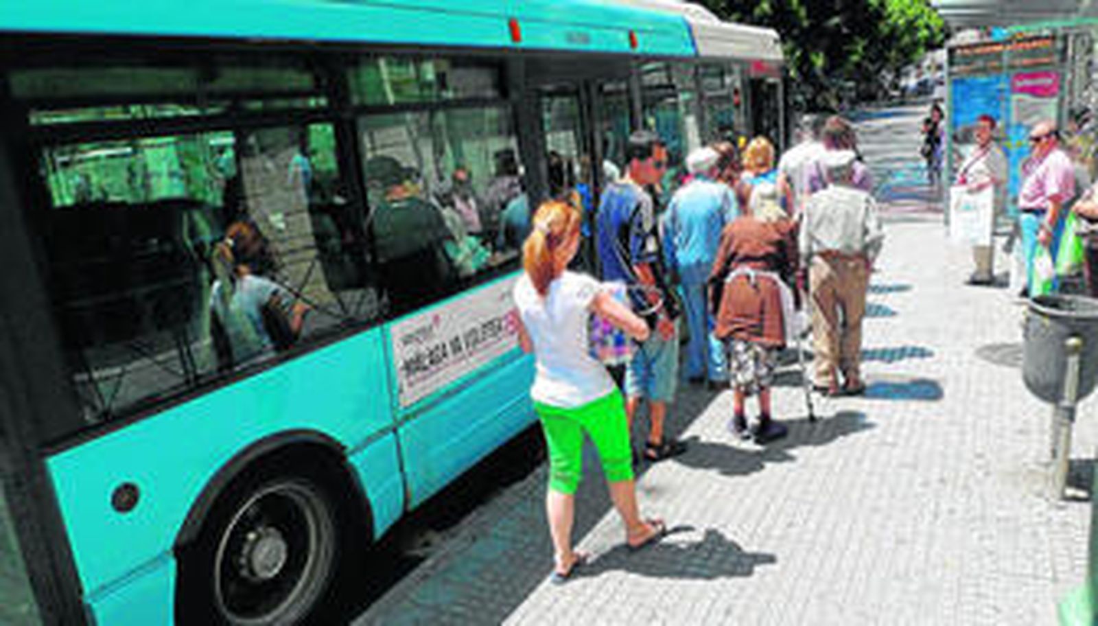 El autobús cruza la Goleta, el Puente de Armiñán y la avenida Gálvez Ginachero. Entre las mujeres cunde de pronto una alarma: "¡El Mercadona, ya está aquí el Mercadona!" En la siguiente parada, la primera de Doctor Marañón, junto al citado supermercado, bajan cuatro de las mujeres del grupo. Dos de ellas las despiden con una advertencia: "¡Gastad poco dinero!" No se vislumbran en sus rostros gestos ni signos que pudieran hacer pensar que hablan en broma. Sube una chica joven, rubia, con el pelo recogido en una coleta. En la segunda parada de Doctor Marañón baja el hombre del jersey de lana y la muleta. Una monja camina por la acera junto a los terrenos de la antigua Citesa, a la sombra. La mujer que conversaba con su compañera sobre la delicada salud de su marido dice a la misma: "Yo ya me meto todas las noches la pastilla debajo de la almohada y me echo a dormir". El autobús enfila por la Avenida Luis Buñuel. Se detiene en la parada frente a La Roca y baja el hombre cargado de bolsas de la compra. Cuando el vehículo retoma la marcha, una de las cuatro mujeres que quedan en la parte trasera anuncia: "¡La Rosaleda! ¿Quién se baja a comprar aquí?". El autobús hace la parada correspondiente en la avenida Simón Bolívar, junto al centro comercial, y bajan dos de las mujeres junto a otros dos pasajeros. Suben cuatro personas, dos matrimonios mayores. Los dos miembros del primero ocupan los asientos que miran al pasillo, frente a los tapizados en rojo. La mujer del otro matrimonio casi se abalanza sobre el asiento que queda libre junto al chófer, y le dice a su marido: "Nene, siéntate aquí". Pero el hombre, moreno, vestido con pantalones cortos de pinzas y una camisa generosamente abierta, se dirige al otro matrimonio: "Lo hemos comprado todo en quince minutos. La María lo apaña todo en nada". Su mujer, extremadamente pálida, rubia y con expresión de fatiga, le llama la atención: "Te estoy llamando para que te sientes aquí pero no me haces caso". El hombre no le hace caso y se sienta en una de las plazas reservadas para personas con discapacidad, frente al otro matrimonio. Siguen hablando. Después llama a su esposa: "María, esta mujer dice que te conoce y que tú le has dado la espalda". Ella responde: "Eso es mentira". Así que baja del asiento elevado y se coloca junto a su marido. Mira a la mujer de enfrente y le dice: "Es verdad, nos conocemos del barrio. ¿Y su hermana, está bien?" El autobús continúa por la Avenida de Valle-Inclán. En Huerta La Palma no se produce intercambio de pasajeros. De las dos mujeres que quedan en la parte trasera del grupo de ocho, una avisa a la otra de que debe solicitar la parada. Ésta responde, con su flor en el pelo: "¡Mira, tranquila, voy!"