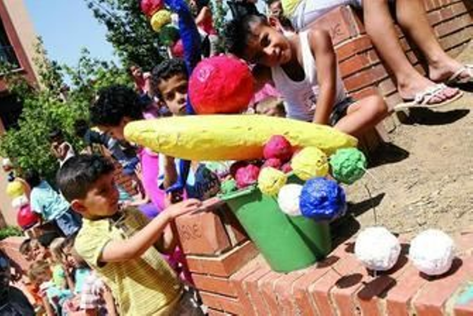 Las esculturas, como explica la directora de este centro escolar, Maribel Serralvo, son la culminación del proyecto Aulas Abiertas que consiste en reunir a todos los alumnos del centro, unos 170, en grupos de varias edades, cursos y clases para trabajar un tema común, que en este caso ha sido el medio ambiente. "Se rompe la estructura del aula y así se favorecen las relaciones del conocimiento", dice la directora. Con participantes de 3 a 7 años, en las aulas de los pequeños, y de 7 a 12, en las de los mayores, los maestros y maestras del colegio han tocado temas como el agua, la luz, la relación de la tecnología y la naturaleza y hasta han realizado una versión de La alegría de vivir, el cuadro que Picasso pintó en Antibes, toda ella con materiales reciclados.