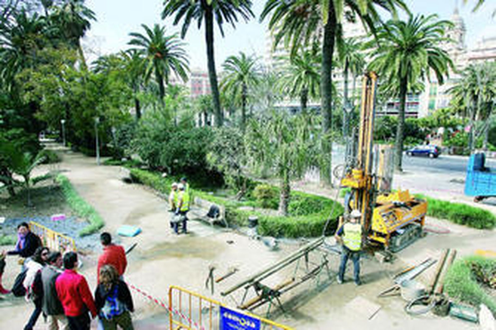 La primera muestra de la obra del Metro de Málaga acaba de llegar al Paseo del Parque. Operarios de la empresa Cemosa, firma contratada por la consultora Typsa, que redacta el proyecto constructivo del tramo Guadalmedina-Malagueta, que transitará por la Alameda Principal y el Paseo del Parque, efectúan desde hace unos días sondeos en diversos puntos del que será el trazado final del ferrocarril urbano hasta su llegada a la estación término, en Paseo de Reding.