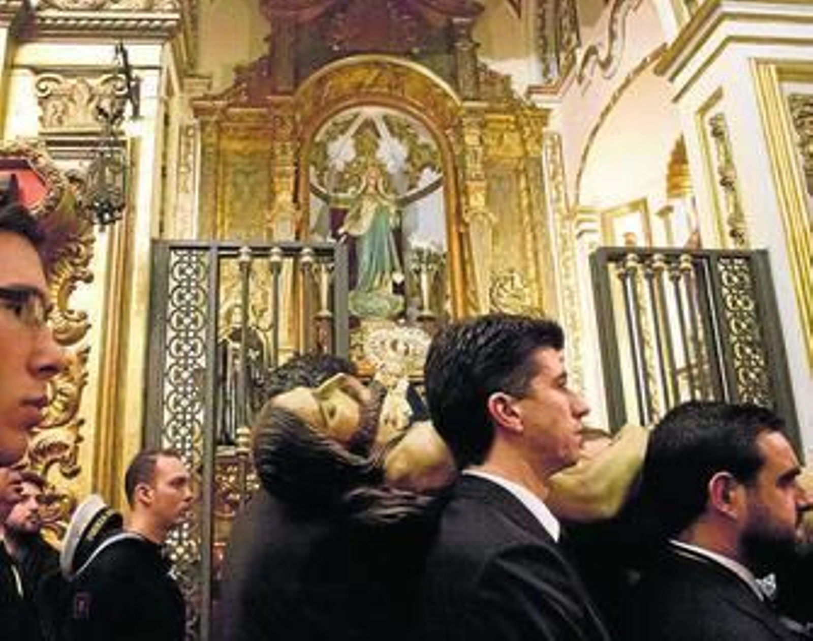 Todo empezó por la tarde, en una misa de despedida del que había su templo y su feligresía desde 1967, año en el que la cofradía se trasladó desde el santuario de la Victoria, su anterior sede canónica. Tras la celebración de la eucaristía dio comienzo una procesión claustral que recorrió todas las capillas de las demás corporaciones acogidas en la iglesia. Ni dentro del templo ni ya en la calle faltó público. Una atestada parroquia vio como el Señor del Santo Sepulcro abandonaba el templo portado sobre los hombros de sus hermanos flanqueado por cuatro ciriales. Mientras, la Virgen de la Soledad iba sobre unas sencillas andas. Al Cristo le acompañaban cuatro tambores roncos de la banda de música de la archicofradía de la Esperanza, formación que acompaña a la dolorosa el Viernes Santo. Ambas imágenes fueron escoltadas por la Marina.