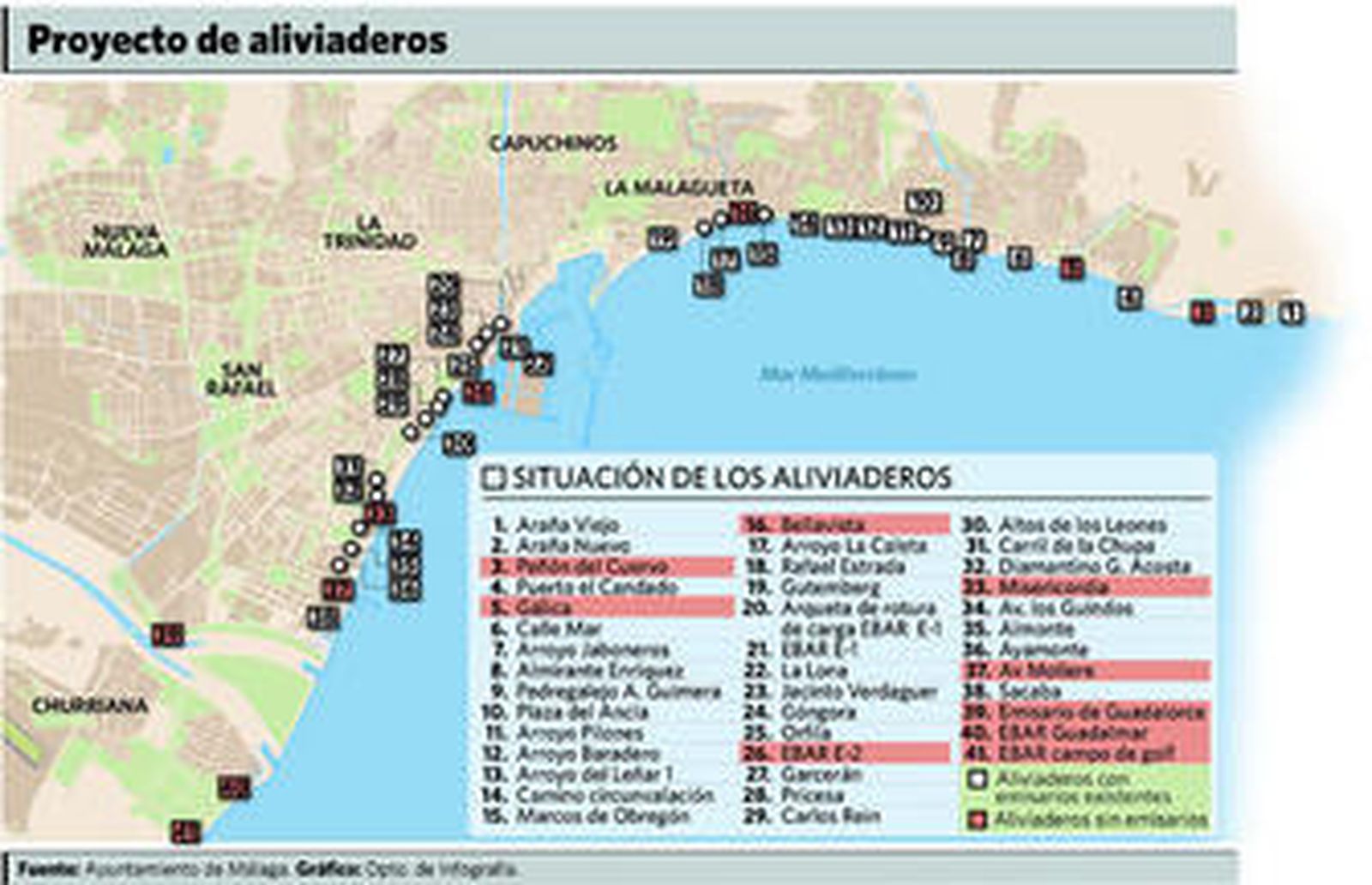La solución que plantea la empresa municipal para acabar con la suciedad de las playas, al menos mejorarla, iba más allá de la zona occidental de la capital. La idea consiste en construir cuatro emisarios submarinos, dos situados en la zona de La Misericordia y otros dos entre la calle Pacífico y el arroyo Jaboneros, para recoger las aguas residuales y pluviales de los numerosos aliviaderos que desembocan en estos puntos y que en la mayoría de los casos desembocan en la misma orilla de la playa.