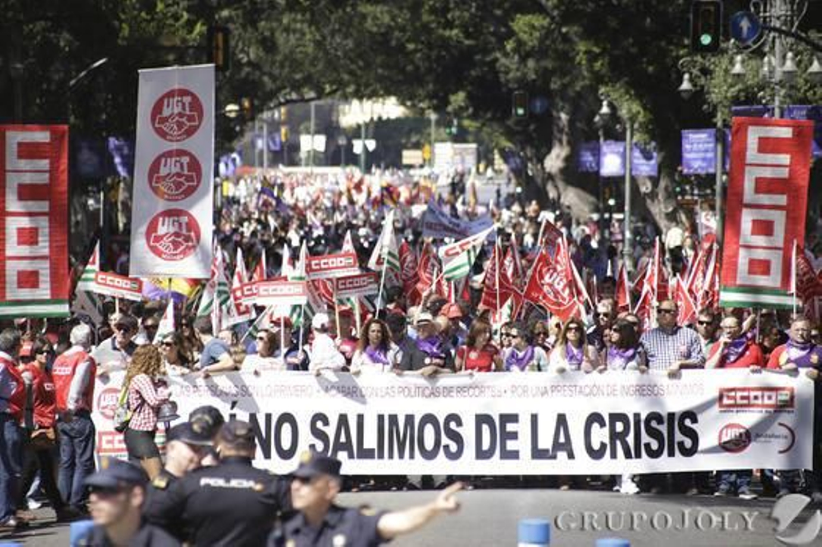 La manifestación salió poco después de las 11:00 de la Alameda de Colón. "Así no salimos de la crisis" rezaba la pancarta que abría la marcha. Como muchos años, la columna avanzó por la Alameda Principal y luego tomó por la calle Larios hasta la Plaza de la Constitución. No hubo petardos ni tantas consignas como otros años. Pero la canción Resistiré con la letra cambiada para arremeter contra la política del Gobierno central-que ya es un clásico en las movilizaciones- puso ritmo a la protesta. "Aunque el recorte se transforme en un deporte, resistiré, resistiré", coreaban los manifestantes mientras se llenaba la plaza poco antes de las 13:00.