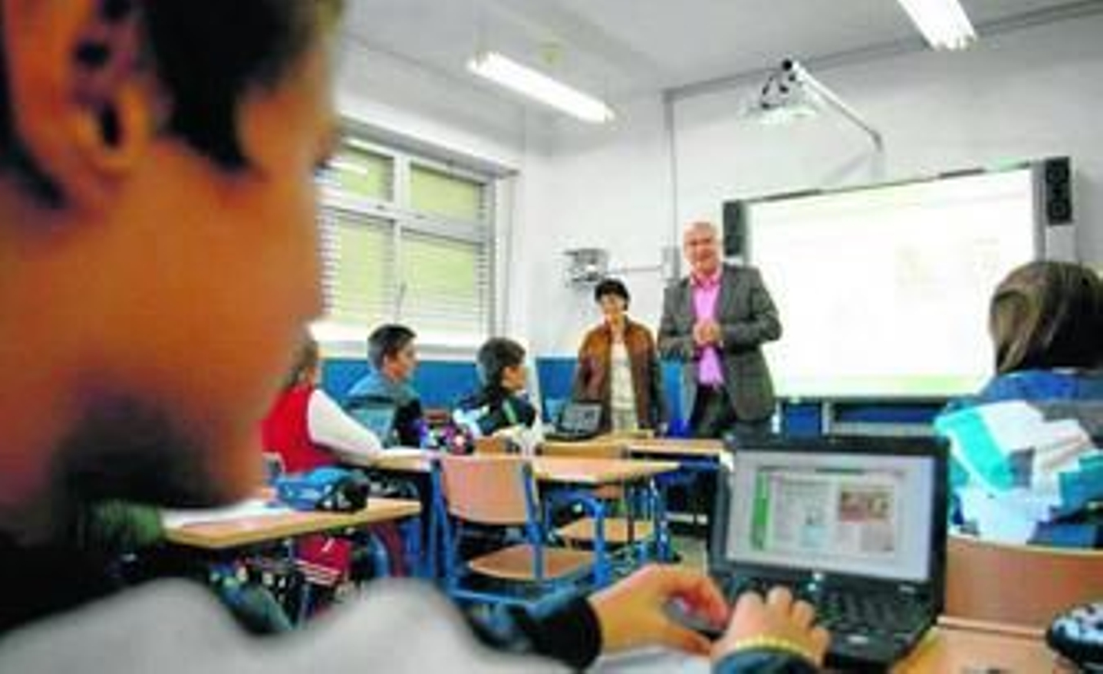 "Estamos intentando que el tiempo de estudio sea provechoso, creativo y divertido y hemos venido a preguntar si es útil este método y si el rendimiento académico es como poco tan bueno como el del papel", explicó ayer a los alumnos Antonio Escámez. El delegado se sentó como un alumno más para seguir las indicaciones de la profesora Rosa Yáñez, que trabaja con una fórmula híbrida que permite tanto utilizar el libro off line como conectarse a internet para ampliar contenidos. "Ahora los alumnos se pelean por salir a la pizarra, mejoran porque están muy motivados, se centran más, el ritmo de la clase es más calmado y aprenden a aprender", dijo Yáñez quien destacó que el propio programa corrige las respuestas de los alumnos. "Existe un gran componente de autoaprendizaje, si queréis podéis avanzar mucho desde casa", abundó en esta idea el delegado.