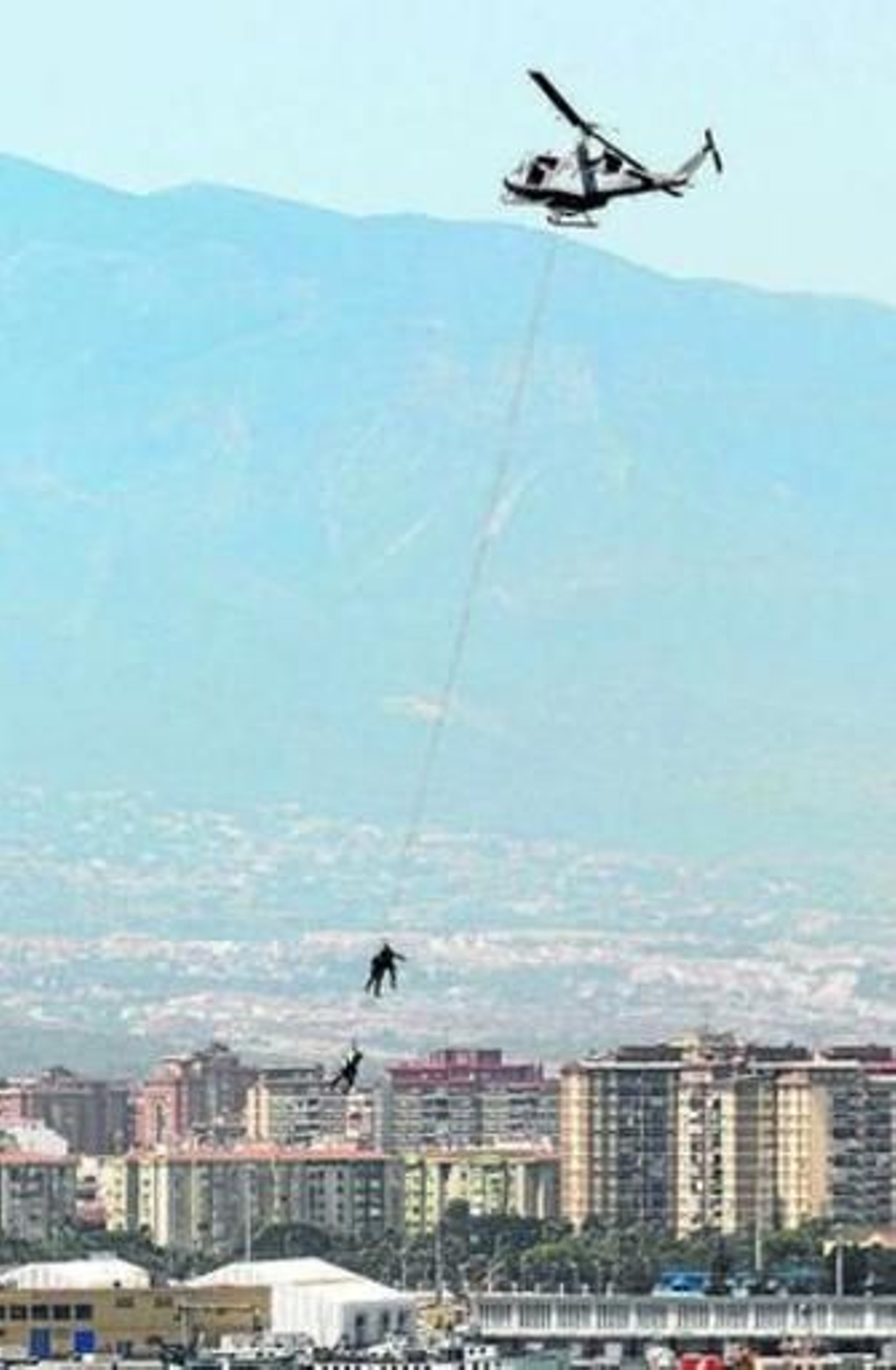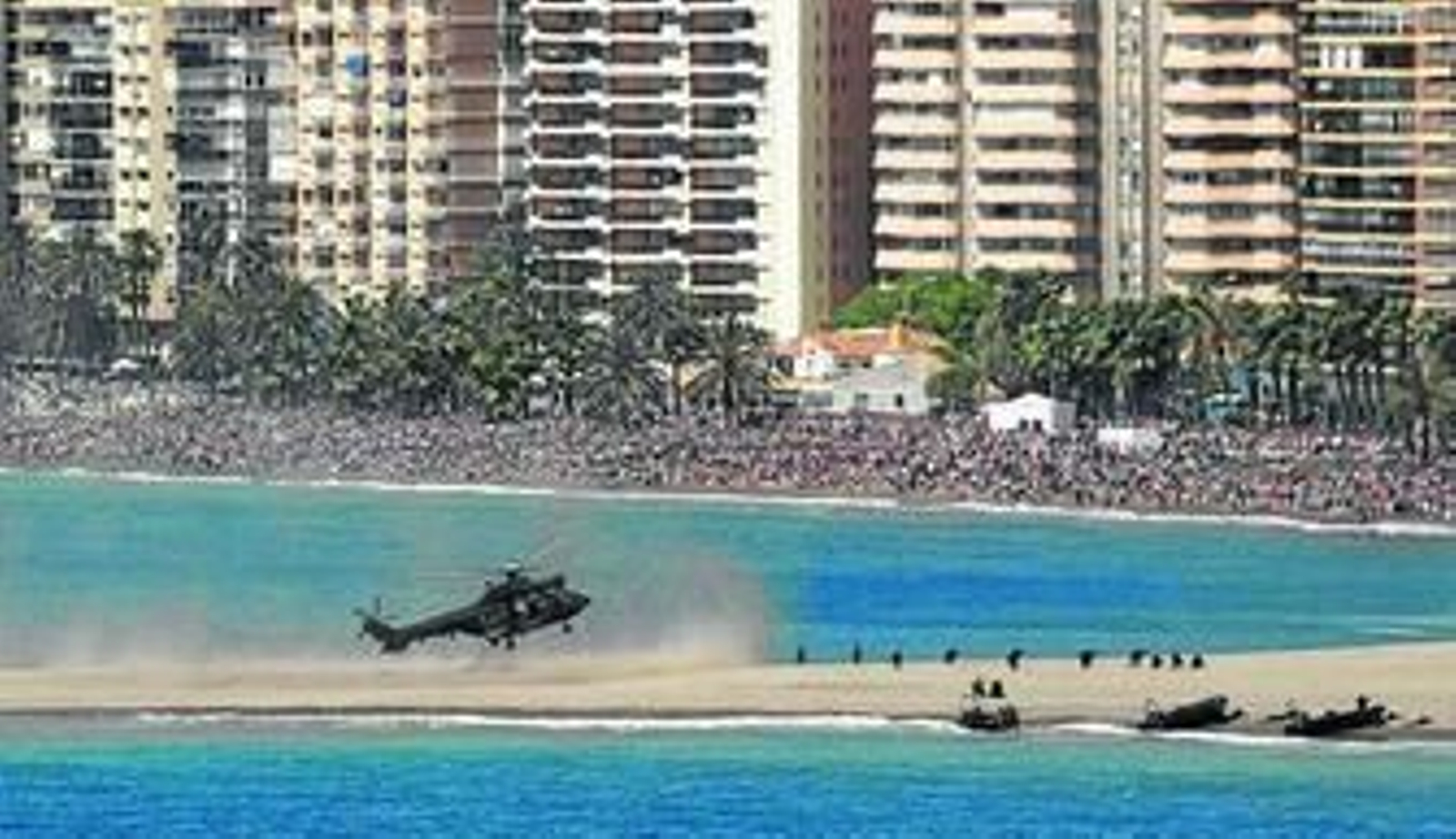 El campo rebelde estaba asentado en la playa de La Malagueta. Llega la hora H. Un helicóptero de la Armada despega de la fragata Álvaro de Bazán y a unos 100 metros de la orilla sobre el mar deja a ocho infantes de Marina que serán los que tendrán que hacer el reconocimiento de la playa. El cazaminas Segura hace un barrido de la zona y desde el cielo, un avión escupe paracaidistas. Son zapadores del Ejército del Aire. Seguir el espectáculo exige atención porque el ataque contra los rebeldes tiene muchos frentes. Un narrador ayuda a comprender la exhibición. Los paracaidistas van descendiendo y los infantes de Marina se acercan a la orilla. Sopla un viento moderado. Desde el suelo parece que los paracaidistas van a acabar en Torremolinos arrastrados por las corrientes de aire. Craso error. Con una precisión sorprendente, caen exactamente en frente de la tribuna. "Aunque se tiraran a 2.000 metros de altura, tienen la capacidad de clavar su talón en una moneda de un euro", asegura un experto aludiendo a su pericia.