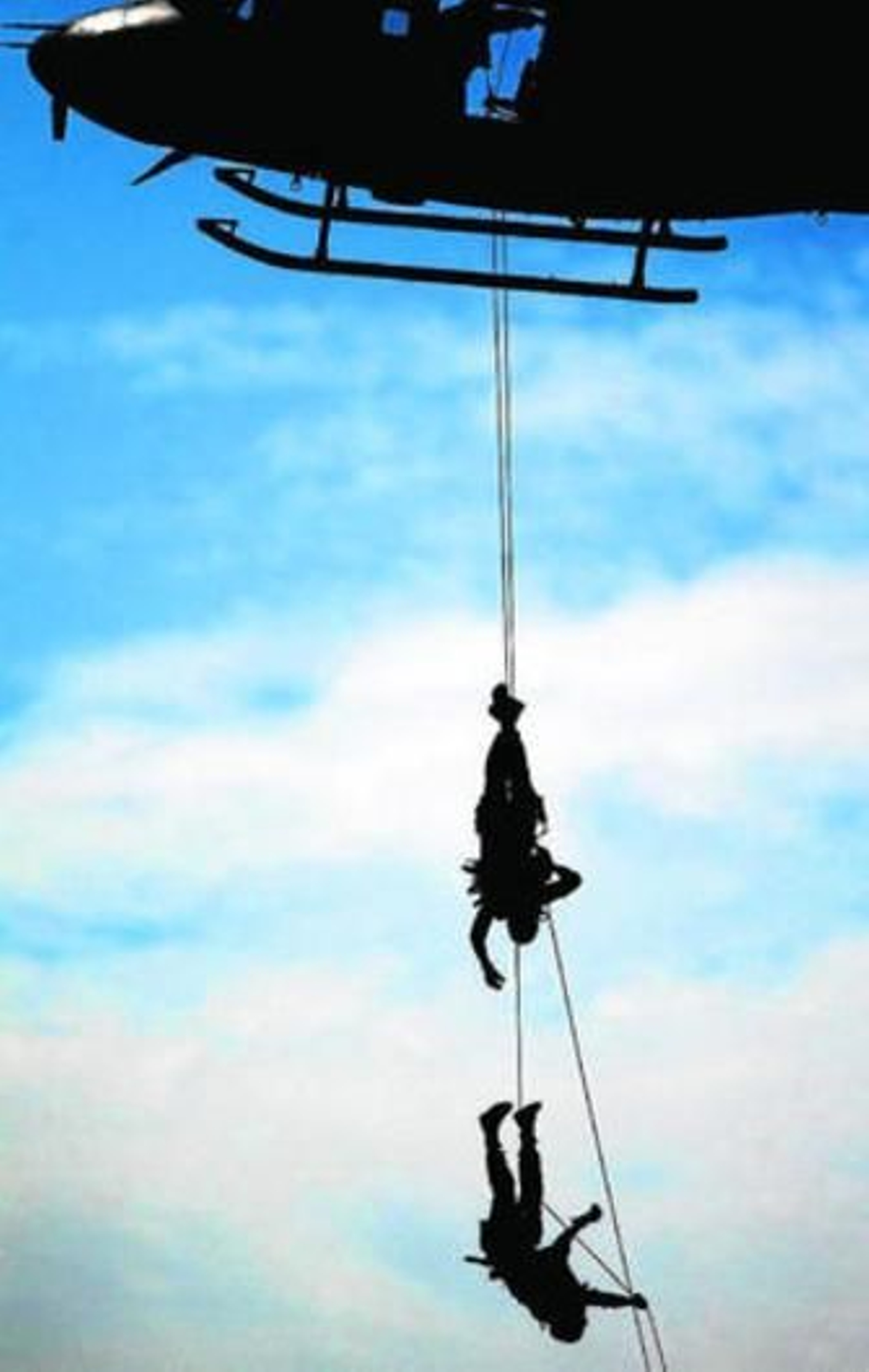 El sol aprieta y el viento molesta, pero el público resiste. Cientos de policías, sanitarios y miembros de Protección Civil velan para que la gente disfrute de una exhibición que intenta acerca el mundo militar a la sociedad civil. Mientras la realidad discurre sin sobresaltos, en la ficción el ataque contra los rebeldes parapetados en la playa se sigue fraguando. Otros dos helicópteros se quedan por unos instantes suspendidos a bastante altura sobre la playa. De repente, varios militares de la Armada se descuelgan haciendo rápel. Pero, lo hacen boca abajo. Toda una demostración de destreza que deja boquiabierto al público.