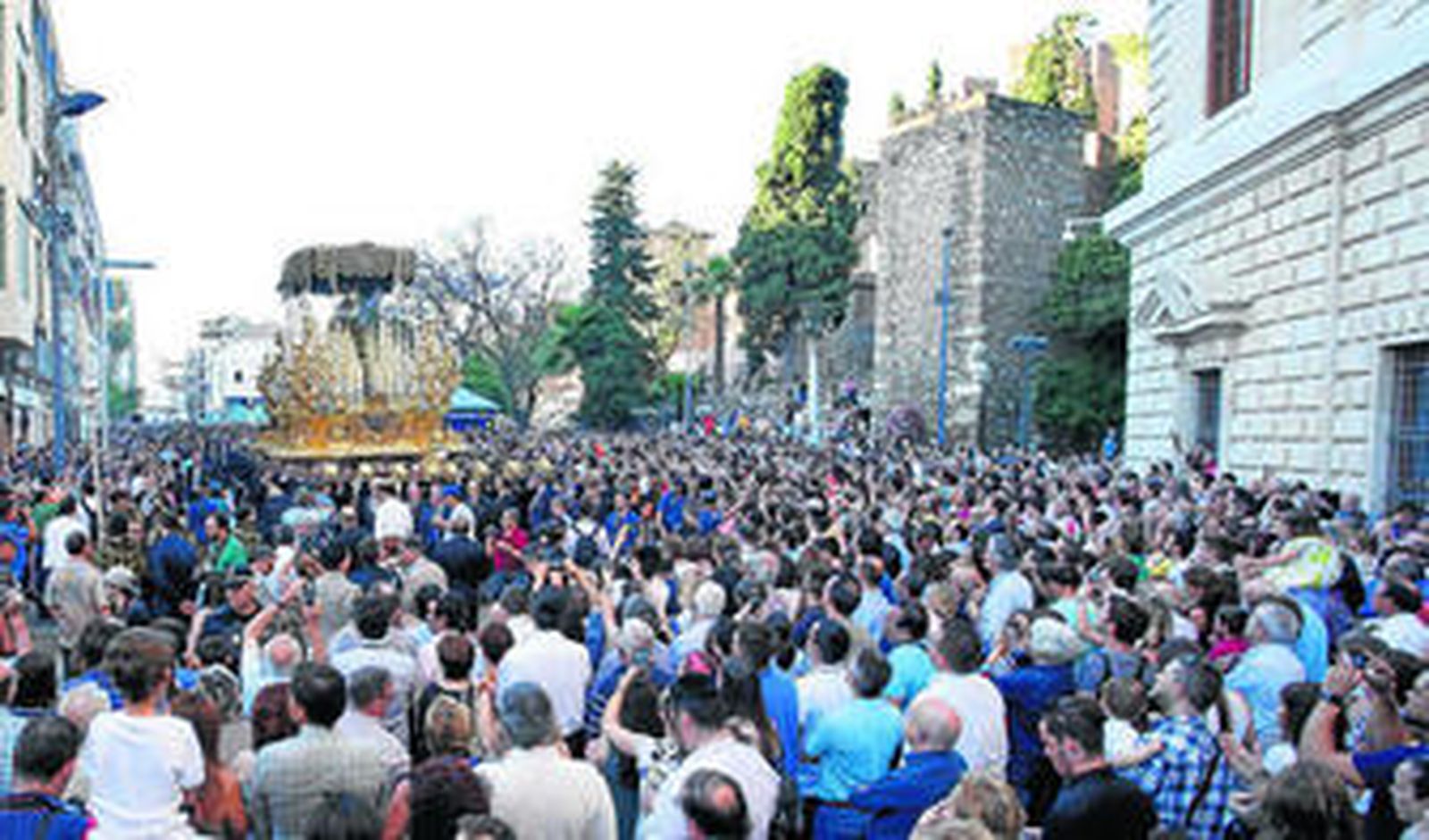 Las lágrimas se intuían entre los congregantes por ver a su Virgen en la calle. Era el momento más esperado. Calle Císter volvía a convertirse en punto de referencia al recibir la primera gran petalada desde balcones de los dos edificios. Aquella Virgen sonaría más adelante en un ambiente que caracteriza al espíritu de la Hermandad. Ya lo diría Ramón Gómez Ravassa, Mena es Mena y su elegancia y sobriedad se demostró con su sello, que no desapareció. Mientras el cortejo abría hueco para que todo avanzase, desde el palacio de los condes de Zea-Salvatierra se cantó la primera saeta por parte de Rufino Rivas. La doble curva del hospital Gálvez se ejecutó con especial mimo.