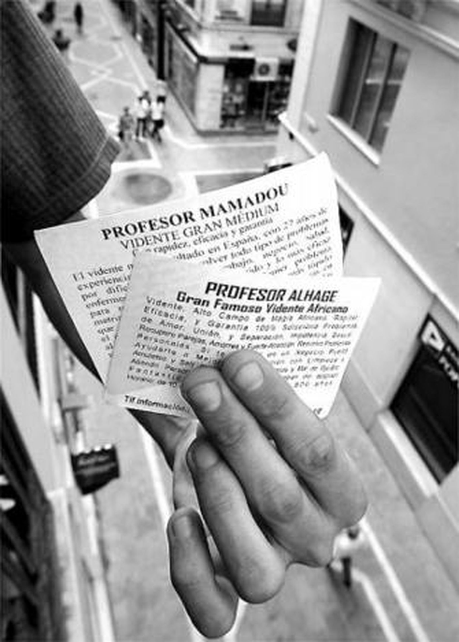 Estafadores que se presentan como poderosos videntes africanos capaces de curar graves enfermedades o ayudar a superar la crisis económica recurren al marketing y reparten octavillas por las calles del centro