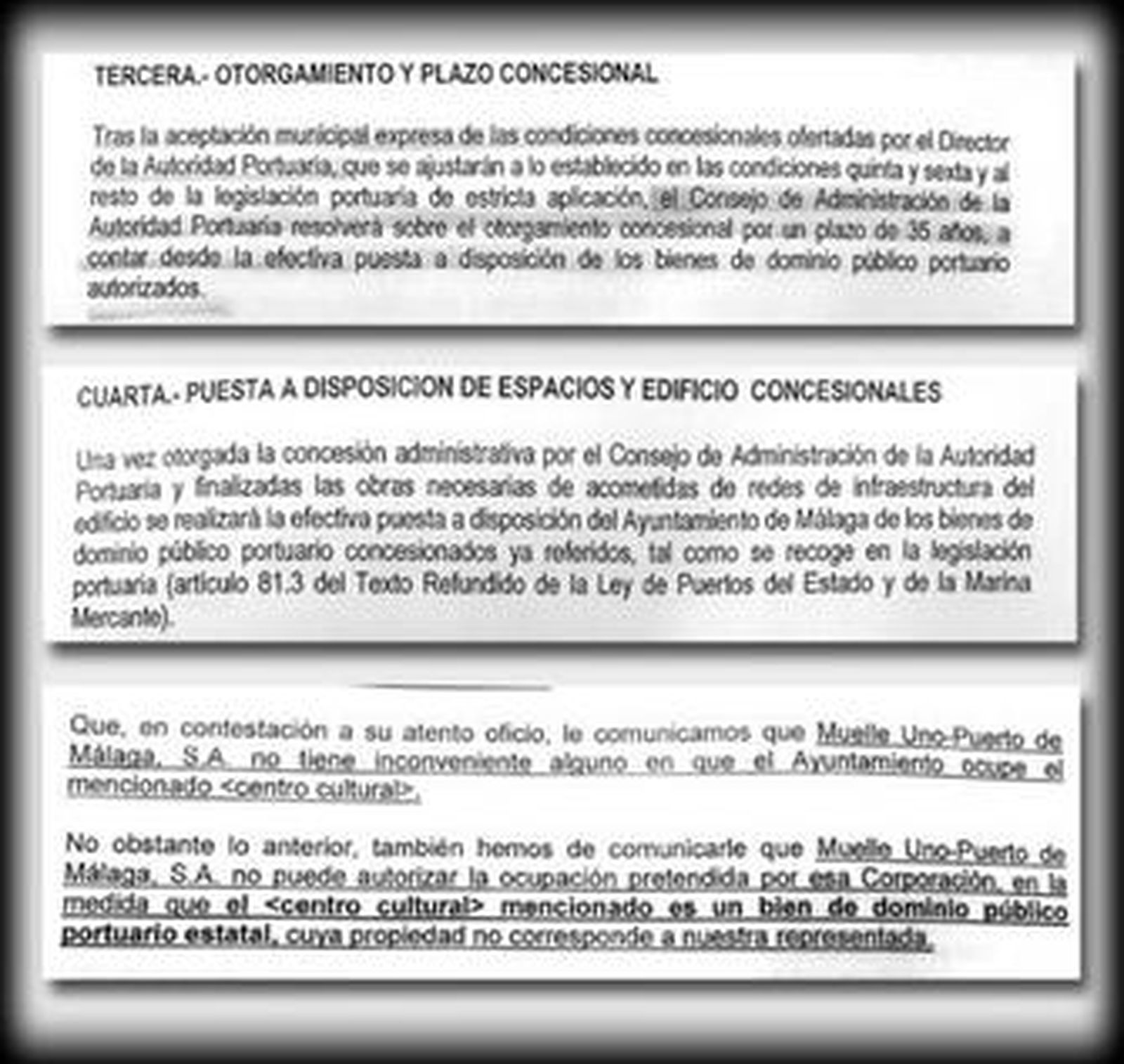 A esta se añade otra, la tercera, que precisa: "tras la aceptación municipal expresa de las condiciones concesionales ofertadas por el director de la Autoridad Portuaria (…), el Consejo de Administración de la Autoridad Portuaria resolverá sobre el otorgamiento concesional por un plazo de 35 años". Al tiempo, el documento apostilla que la "efectiva" puesta a disposición del Ayuntamiento se realizará "una vez otorgada la concesión administrativa por el Consejo de Administración de la Autoridad Portuaria". Un paso que sigue sin producirse.