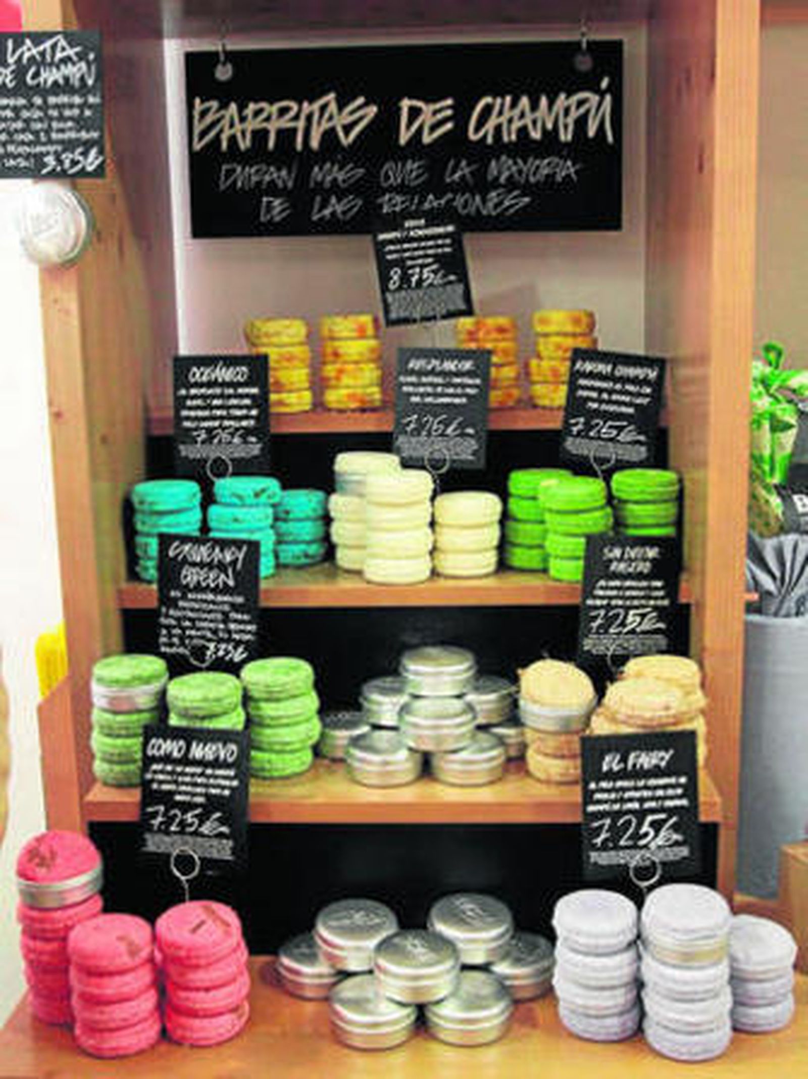 "Aunque no podemos decir que todos nuestros productos son naturales, porque algunos llevan conservantes, sí hay algunos que son cien por cien natural como es el caso de las mascarillas", explica una de las dependientas de Lush. Por 8,25 euros puede adquirir tarrinas de 75 gramos de mascarilla de chocolate y barro, algas y almendras, papaya, kiwi y arándanos, entre otros tipos. Los jabones son uno de los productos estrellas de este establecimientos. Los hay especiales para pieles secas, para sarcoidosis cutánea e incluso hay especiales para los más pequeños. Entre la amplia variedad destaca el denominado Karman, un aromático jabón en capas de naranja y especias exóticas. También puede comprar Cariño he lavado a los niños, con un aroma a miel y toffee; o Porridge, un jabón de avena, exfoliante y nutritivo. Todos estos jabones se vende al peso y el precio medio es de unos 4 euros, aunque puede variar según el producto.