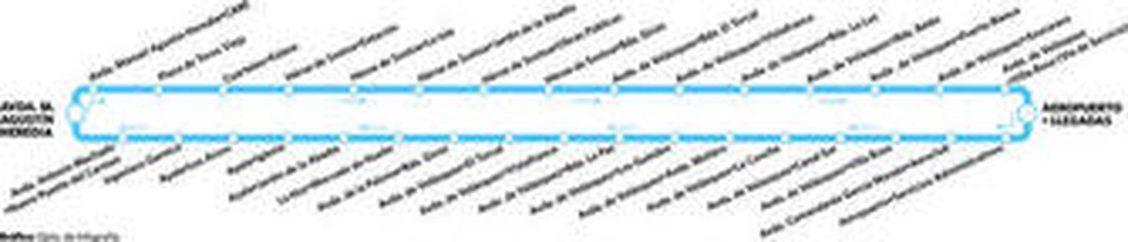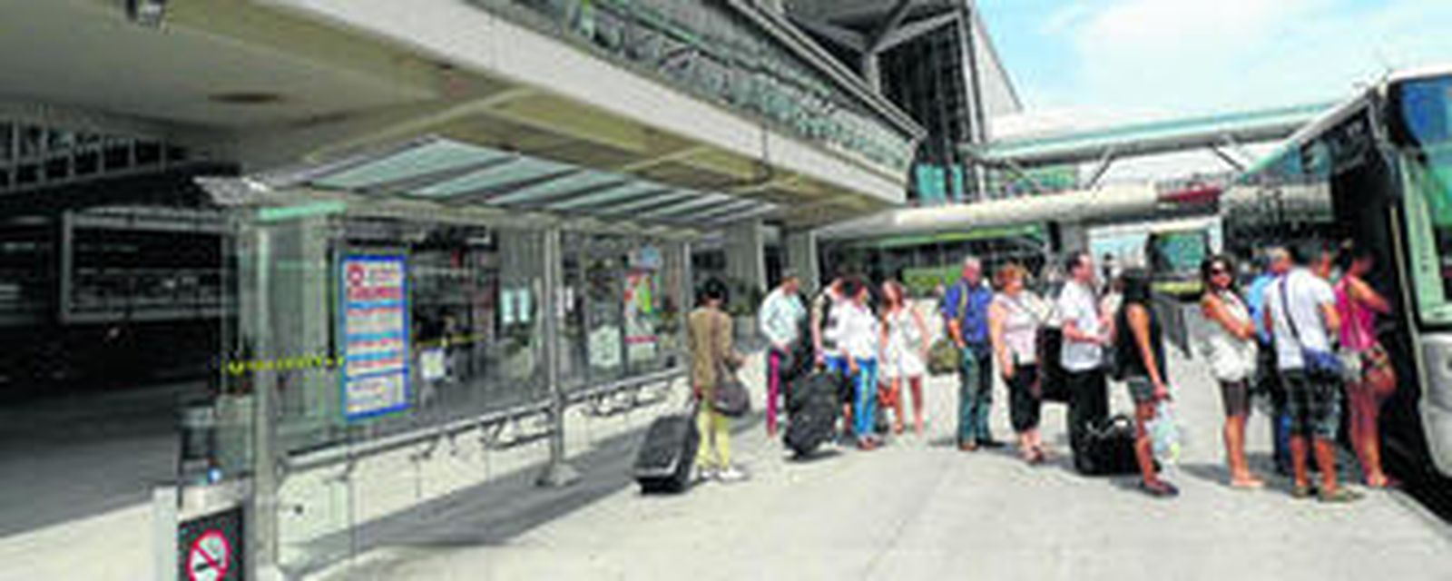 Los locales que anuncian plazas de aparcamiento a bajo precio compiten en el impacto de sus ganchos publicitarios. Dejada a un lado la fábrica de San Miguel, la rotonda soporta un volumen notorio de tráfico. El autobús continúa hasta la nueva terminal y toma un carril exclusivo que conduce hasta otra rotonda situada al lado al acceso de la torre de control, da la vuelta y llega a la última parada. Algunos recién llegados esperan en la marquesina, pero casi todos preguntan por Marbella. Son las 10:57. Fin del trayecto.