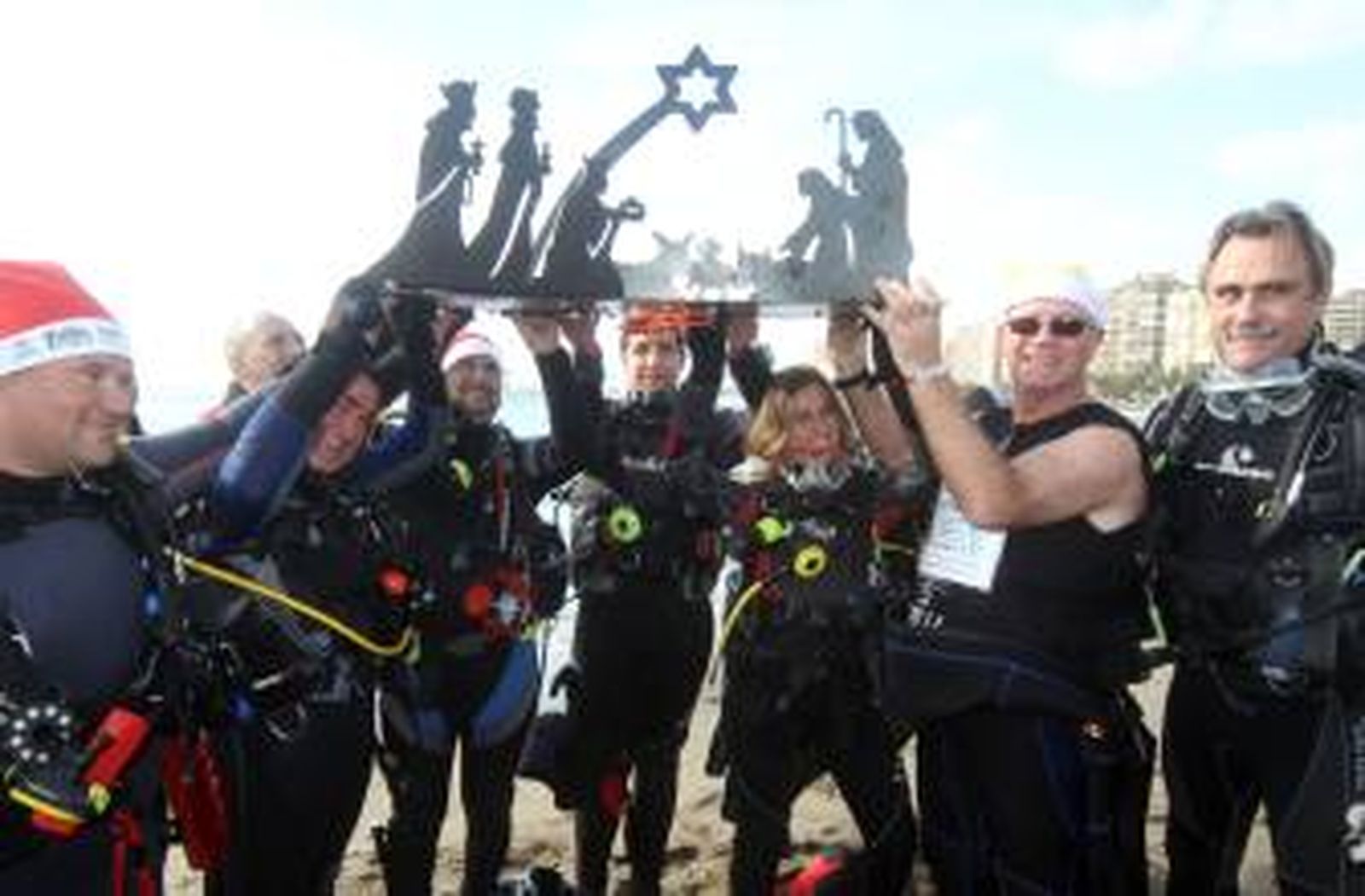La Asociación Universitaria de Actividades Subacuáticas, AUAS, y la Asociación Ntra. Sra. del Carmen patrona de los submarinistas malagueños sumergieron en la mañana de ayer y por quinto año consecutivo, un portal de belén en las aguas de la bahía de Málaga, junto al espigón del Perro en el paseo marítimo Pablo Ruiz Picasso.