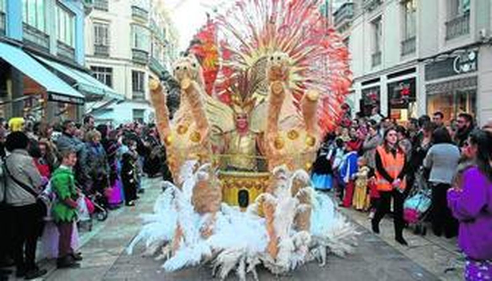 Una batucada de payasos abrió la comitiva, que se inició pasada la hora prevista, seguida de los dioses. Bajo una constante lluvia de confeti, grandes y pequeños disfrutaron de las carrozas y los grupos de animación de distintos países, así como de algunas de las agrupaciones finalistas en el concurso de coplas. Un grupo de majorettes, los pequeños minions de la murga infantil, princesas Disney o animaciones de zancos y malabaristas también animaban el desfile. Además, cuatro charangas ponían el hilo musical al pasacalles con algunas canciones populares. Eso sí, aunque los verdaderos protagonistas de la jornada fueron los más pequeños de la casa desde que esa misma mañana se celebrara la gala infantil, no faltaron adultos, padres o no, que disfrutaron de la fiesta en grupo y bajo un disfraz.