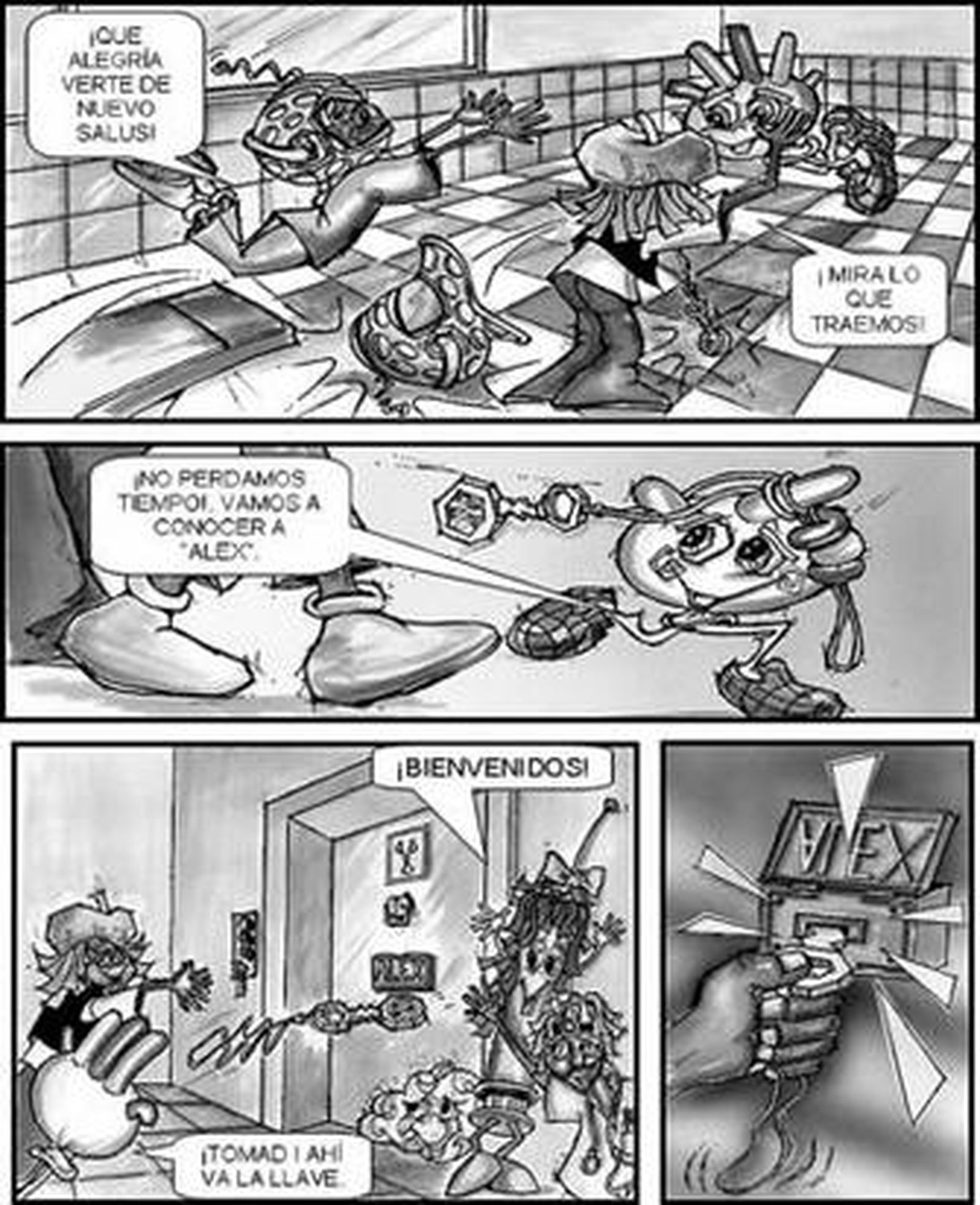 También aparece Alex, el acelerador lineal; o el escáner de simulación, como la puerta a la fantasía; y el equipo de anestesia, como un arma que les inmoviliza para hacerles invisibles. Los autores del cómic son dos profesionales de enfermería de Oncología Radioterápica, Juan Carlos Florido Martín y Encarnación Martín Sánchez, y un técnico de radioterapia, José Manuel Peña Gómez.