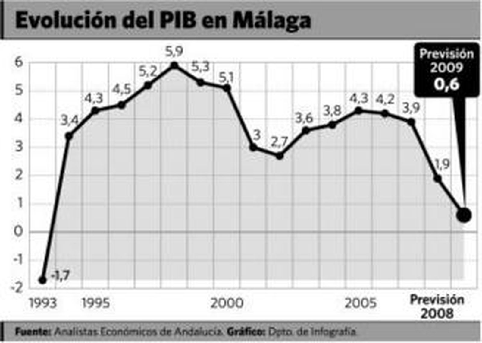 En ambos casos, el aumento del PIB será el más bajo desde la última crisis de 1993, un año en el que la provincia entró en una fuerte recesión con un descenso anual del 1,7%. No obstante, el lado positivo es que, según Felisa Becerra, coordinadora del informe, "tanto en Málaga como en Andalucía no hay previsto que en esta ocasión entremos en recesión [se entiende que hay recesión cuando el PIB es negativo durante al menos dos trimestres consecutivos], aunque sí es posible que algún trimestre haya un comportamiento negativo o crecimiento nulo". En España se vaticina que habrá recesión ya en el segundo semestre del presente año, y en el conjunto europeo tampoco pintan bien las cosas pues en el segundo trimestre de 2008 hubo un descenso del 0,2% del PIB en la Zona Euro y caídas en Alemania, Francia e Italia. ¿Qué quiere decir esto? Que, dentro de la difícil situación económica mundial, Málaga y Andalucía, por ahora, mantienen el tipo.