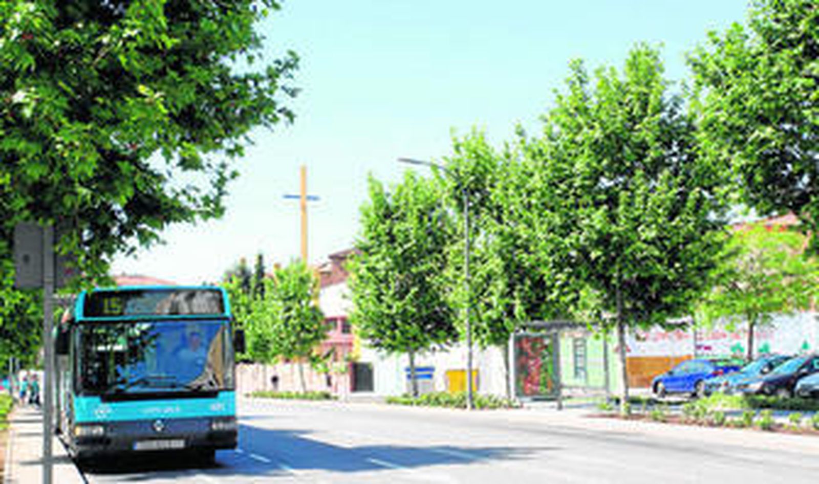Son las 10:15 en la Plaza Herbert von Karajan, en la Virreina. Es una mañana luminosa, prometedora del verano. Algunos vecinos pasean, van a hacer la compra, sacan a sus perros o leen el periódico sentados en un banco. El barrio respira una placidez serena en consonancia con las aceras limpias. Las jardineras despiden un fuerte a olor a abono. En la parada del 15 el sol calienta de manera implacable y la marquesina apenas logra proyectar un hilo de sombra, así que algunos usuarios que esperan el autobús han tomado posiciones bajo los árboles para evitar el sofoco. El vehículo sale a las 10:20 con nueve pasajeros a bordo, entre ellos una señora que mantiene una breve conversación con el chófer a cuenta de una parada del trayecto, una madre que sube con su bebé sentado en un cochecito y dos jóvenes amigos, chico y chica, que mantienen una conversación repleta de risas sobre una película que ambos vieron la noche anterior en televisión. En la primera parada del Camino de la Virreina no se incorporan pasajeros. Hay pintadas ofensivas en algunas fachadas, la iglesia de Pío X está cerrada a cal y canto y en el campo de fútbol alguien da patadas a un balón. En la segunda parada suben dos mujeres, una gitana oronda y muy morena que deja dos bolsas de plástico sobre un asiento antes de dejar las monedas en el mostrador y una africana también gruesa con el pelo recogido en trencitas que lleva a su pequeña en otro cochecito. En la siguiente parada, la primera de la Avenida de la Palmilla, frente a la comisaría, sube un matrimonio de ancianos. Él lleva una gorra azul de pintor. Y en la siguiente, cruzada ya la Avenida de Valle-Inclán, sube otro señor mayor que lleva también una gorra azul, idéntica, y que se tambalea un poco antes de sentarse. En esta sección de Huerta La Palma hay coches aparcados en las aceras amplias, convertidas en una suerte de parking tácito. Un tipo sin camiseta pasea a un rottweiler cojo y castigado.