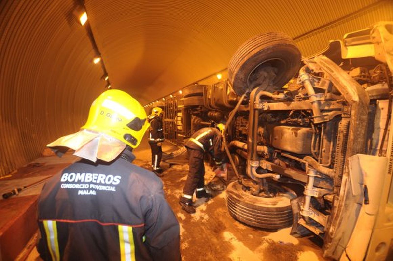 El vuelco de un camión en un túnel de la A-45, próximo al municipio de Casabermeja, provocó ayer retenciones de hasta seis kilómetros en ambos sentidos de la autovía, según informaron fuentes del Centro de Gestión del Tráfico de Málaga. Las dificultades que entrañan actuar en el interior del túnel demoraron los trabajos para retirar el vehículo y limpiar la calzada, por lo que los atascos se prolongaron, al menos, durante 12 horas en ambos sentidos. La carga del camión, que transportaba carne y chacina, también se convirtió en un contratiempo por la dificultad de retirar la grasa que quedó esparcida por el firme y el combustible derramado por el propio camión en la calzada. Esto, unido al mal tiempo que azota estos días la provincia, complicó las labores para restablecer la normalidad de la vía. "Al accidente se han unido las dificultades del mal tiempo y que la carga era problemática. La grasa que ha soltado la chacina es muy difícil de limpiar, pero hemos puesto todos los medios posibles", explicó la directora del Centro Provincial del Tráfico de Málaga, Trinidad Hernández.