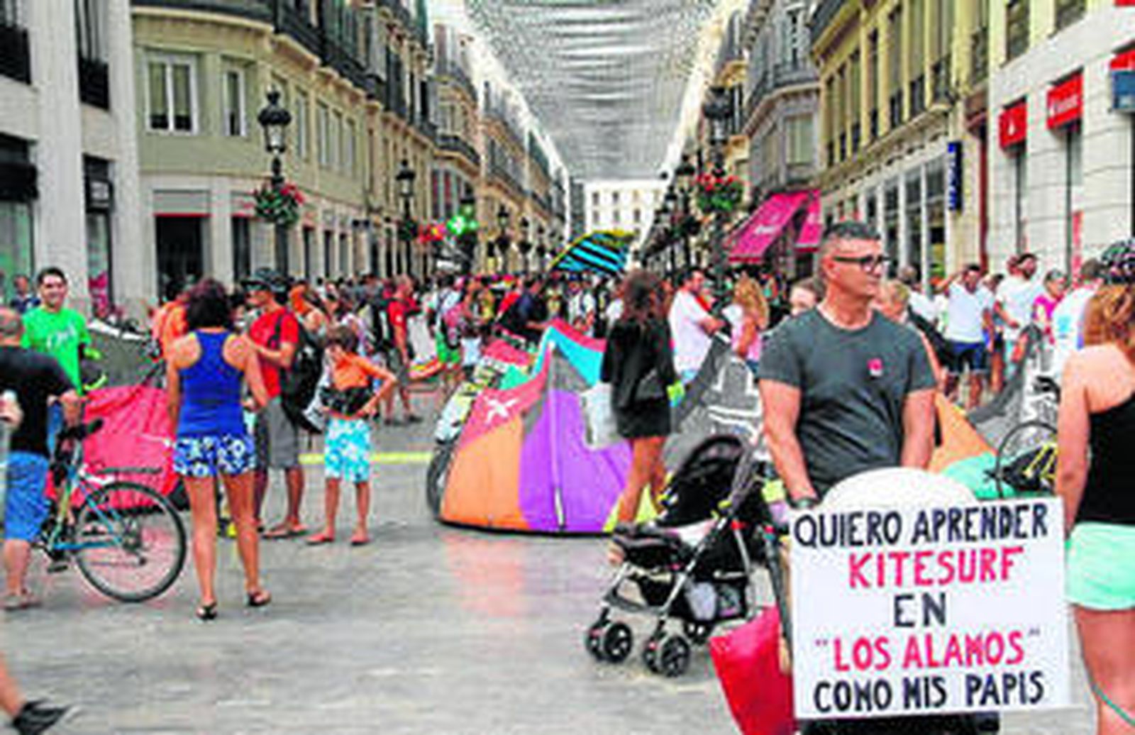 "¡No volamos, solo navegamos!" Ese es el lema de una protesta que muchos consideran "innecesaria". Ayer, los kitesurfers ocuparon desde las 18:00 hasta las 20:00 la calle Larios. Llenaron la arteria principal de la ciudad con cometas de colores para exigir que les dejen practicar kitesurf donde siempre, en la playa de Los Álamos. Tras 15 años de deporte seguro y libre de incidentes, la zona se quedó sin tablas. La prohibición provisional se llevó a cabo a petición de Aeropuertos Españoles y Navegación Aérea (AENA) el 22 de julio. El desencadenante, según informó a este periódico Marta Balmori, secretaria de la Asociación de Deportes Náuticos (ADN), fue un accidente entre una avioneta y un parapente a motor.
