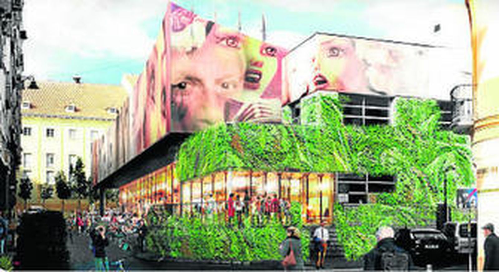 En las zonas bajas del cerramiento que se mantiene del actual mercado, se incorporarán muros vegetales que permitirá crear un microclima en el interior del edificio de forma sostenible. La cornisa superior que rodea al edificio será una gran composición pictórica que homenajeará a los personajes malagueños y andaluces de mundo de la cultura y el arte más ilustres y que será obra de artistas locales. Sobre este collage, se prevé la instalación de una pantalla publicitaria donde se proyectarán en tiempo real las actividades y ofertas culturales que se lleven a cabo en la ciudad.
