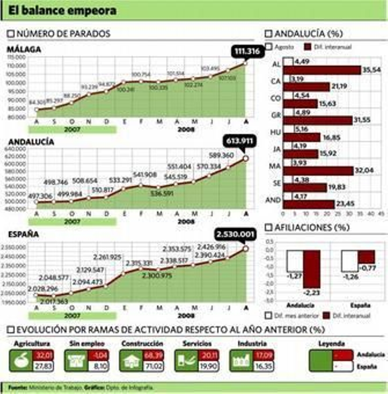 El frenazo del sector de la construcción -en el que también influyó la finalización de numerosos contratos temporales-; los malos registros que la crisis está ocasionando en el turismo; la finalización del año agrícola, y la debilidad que viene mostrando la industria (su actividad se desplomó un 2,8% en el segundo trimestre) explican el mal comportamiento del desempleo, cuyo ascenso mensual casi duplicó el de agosto de 2007. Traducido en cifras, el sector servicios dejó sin trabajo a 46.344 personas (un 3,28% más que en julio); le siguieron la construcción (38.531, un 9,87% más), industria (15.881) y agricultura (1.826). Si se toman como referencia los 12 últimos meses, la evolución de los dos primeros es bastante signiticativa, con la incorporación a sendas ramas de 242.544 y 178.177 parados.