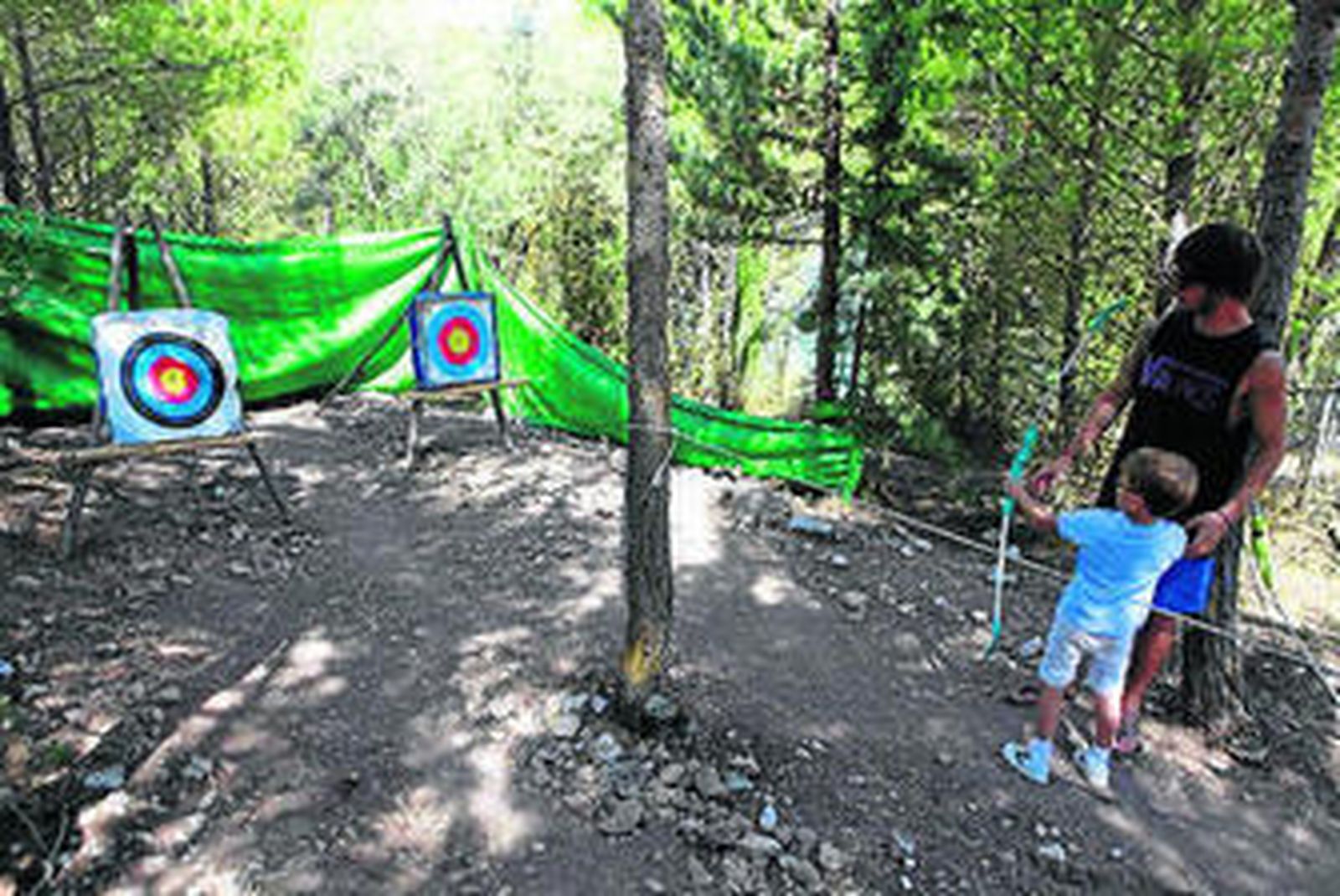 Se escuchan risas y chapoteos en el muelle. Un grupo de niños acaba de subirse en la banana y van a ser remolcados por una lancha a través del pantano. A la derecha, otro grupo de diez practican vela ligera y un poco más alejados del agua, en un claro entre los árboles, pequeños de entre 5 y 7 años superan el reto de tiro con arco. "Cuando pase un poco el calor saldrán algunos grupos a realizar cross de orientación. Les enseñamos a manejar una brújula y a leer un mapa a través de unas claves con colores, para que completen un recorrido por las cercanías del camping", indica Román.