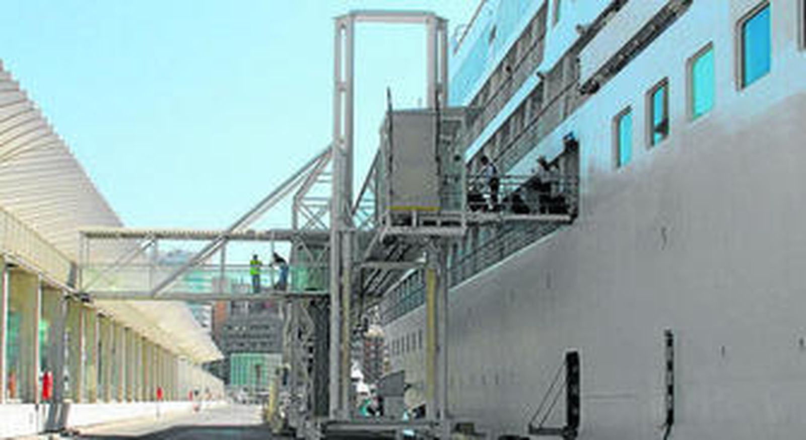 La pasarela de la estación marítima del Palmeral finalmente se acopla a un buque turístico tras dos intentos fallidos
