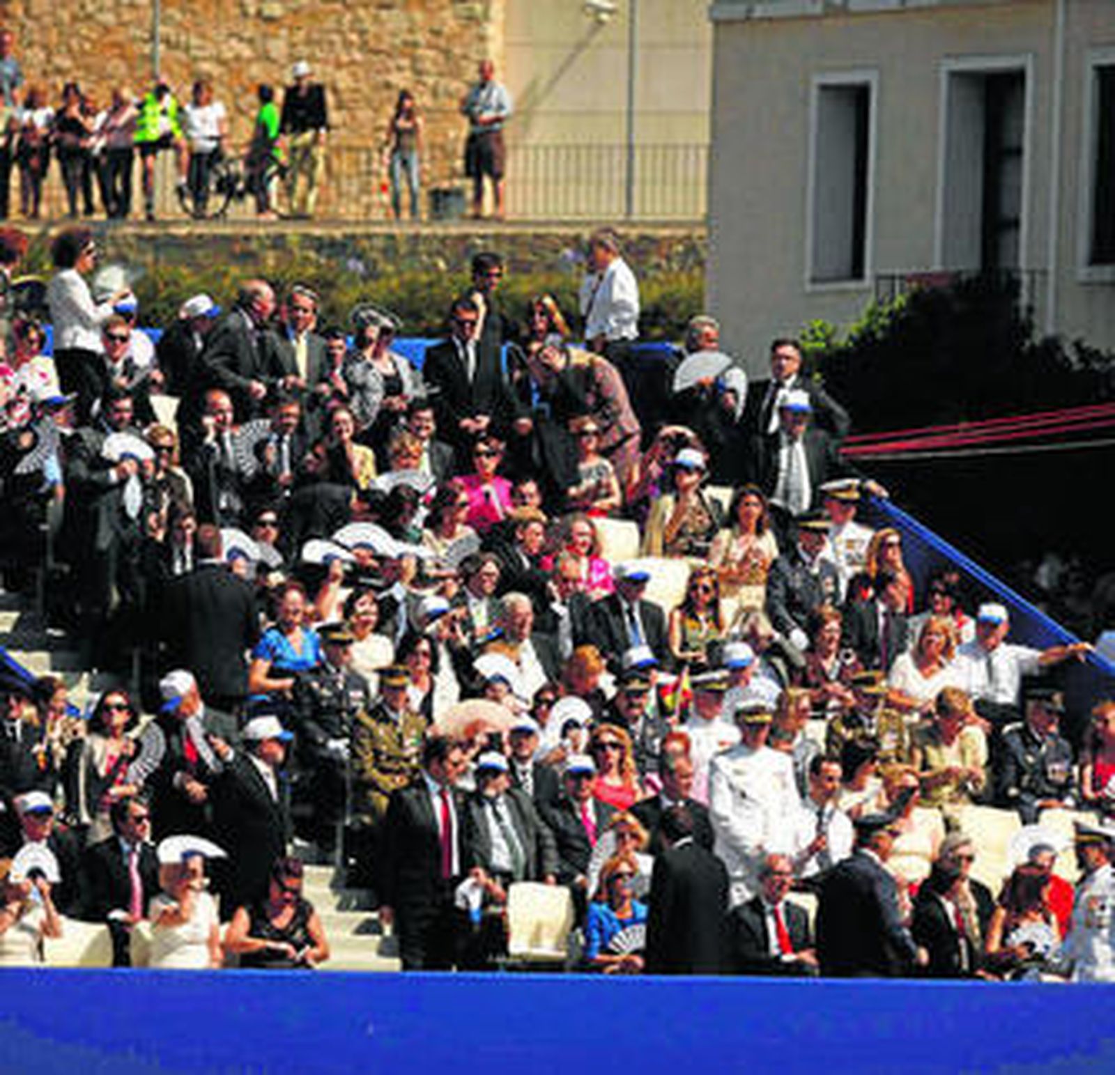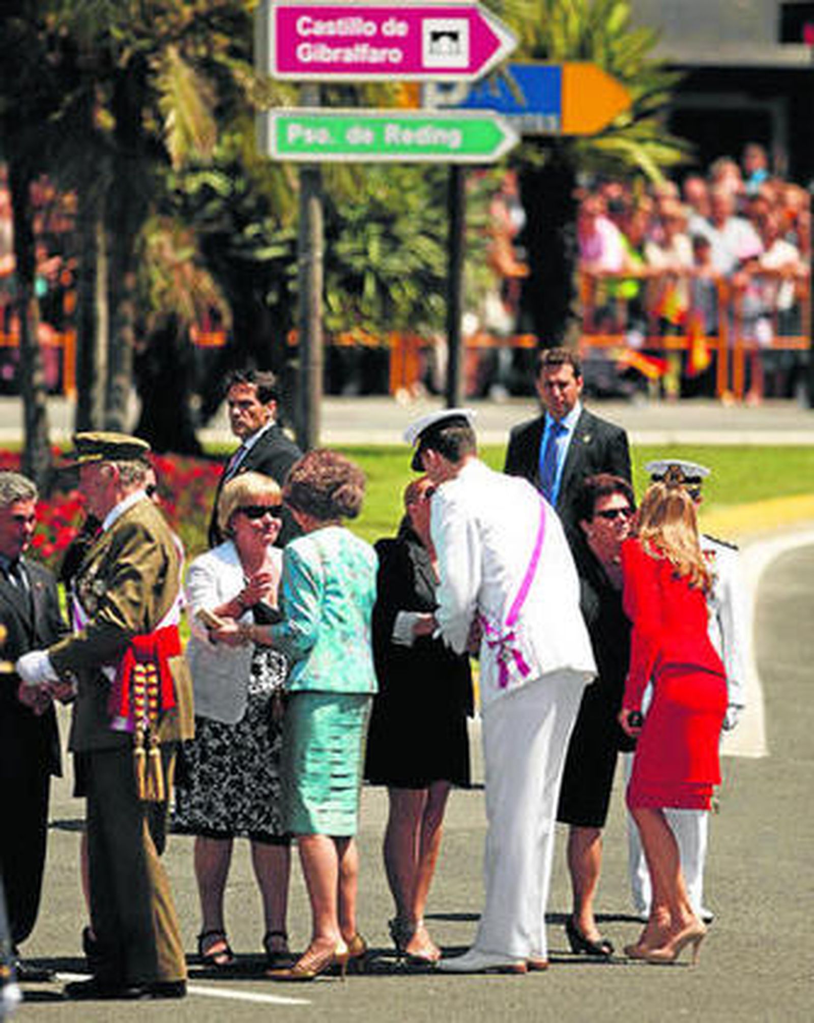 Cuando los coches oficiales se acercaron a la gran tribuna instalada frente al Hospital Noble ya no cabía un alma en todo el Paseo del Parque. Los vivas se multiplicaban. Los madrugadores de las primeras filas identificaron a los Reyes en uno de los automóviles y entonces la aclamación fue absoluta. Una bandada de pájaros salió escopeteada de Gibralfaro cuando se produjeron los 12 cañonazos estipulados. Muchos, entonces, mostraban su rabia porque tanta gente no dejaba ver nada; pero menos aún se vería después, sobre todo más allá del Ayuntamiento. Hubo vítores para los Reyes, los Príncipes y sobre todo para la Legión, recibida como el hijo que vuelve a casa por Navidad. Y lo cierto es que muchos, en el Paseo del Parque, esperaban un desfile. Los pasquines en los que se informaba del programa de actos brillaban allí por su ausencia. Y nada advirtió la megafonía al respecto. Justo frente al Ayuntamiento, una mujer se quejaba cuando comenzaba ya la liturgia con honores a la bandera de que la pantalla instalada allí mismo era "estratégicamente demasiado pequeña" (sí, lo dijo así) y de que, con tanta gente, desde atrás no se veían ni aquellas imágenes. "No vamos ni a oler el desfile", remató. "¿Qué desfile?", preguntó un señor de camisa de rayas arremangada. "Qué desfile va a ser, pues el desfile", respondió la anterior. "Que yo sepa, no hay anunciado ningún desfile". "¿Cómo que no?" De inmediato se incorporaron más participantes en el debate. Hasta que algunos reclamaron silencio dada la solemnidad del acto y aquella compostura digna de misa regresó, más o menos. Los playeros que se habían dado un chapuzón o se habían contentado con tomar el sol cumplieron su amenaza y buscaron hueco. Hubo vendedores de latas de refrescos y frutos secos. Entre lo que se veía y se intuía la gente aplaudía y ondeaba sus enseñas a la vez que se contenía en el exigido recogimiento. Hasta que lo que parecía un desfile avanzó tímidamente hasta el Ayuntamiento y luego se disolvió como si nada. Fin de fiesta. Quienes esperaban desde allí hasta la Marina vieron su gozo en un pozo.