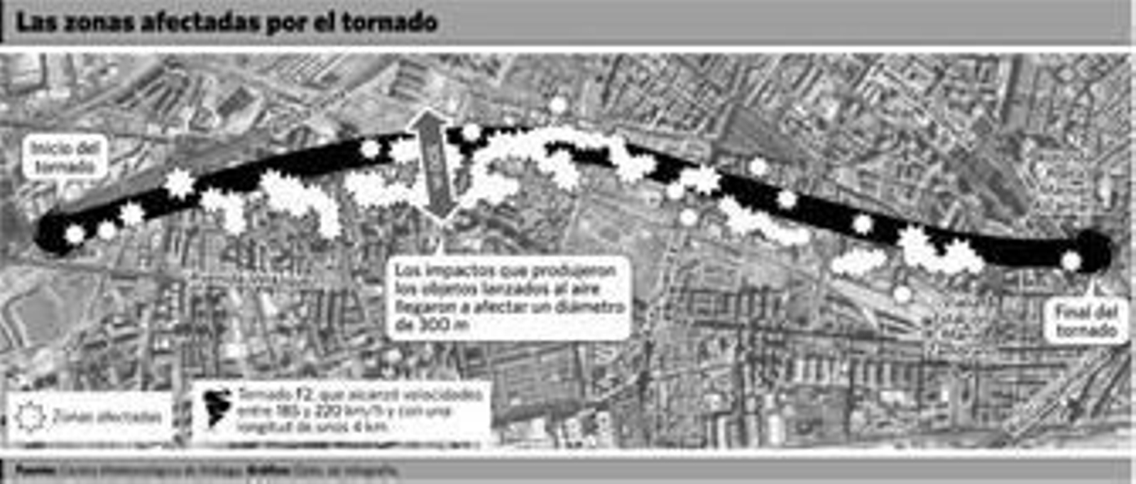 Los cuantiosos destrozos que dejó a su paso el tornado que arrasó la zona oeste de la ciudad el pasado 1 de febrero hacían pensar a los meteorólogos que podía ser el más virulento ocurrido nunca en España y no se han equivocado. El informe final de la Agencia Estatal de Meteorología determina que los vientos alcanzaron una velocidad máxima de 220 kilómetros por hora, un fenómeno "insólito" del que no se tiene constancia que se haya producido en un núcleo urbano al menos en los 150 años que existen estadísticas meteorológicas.