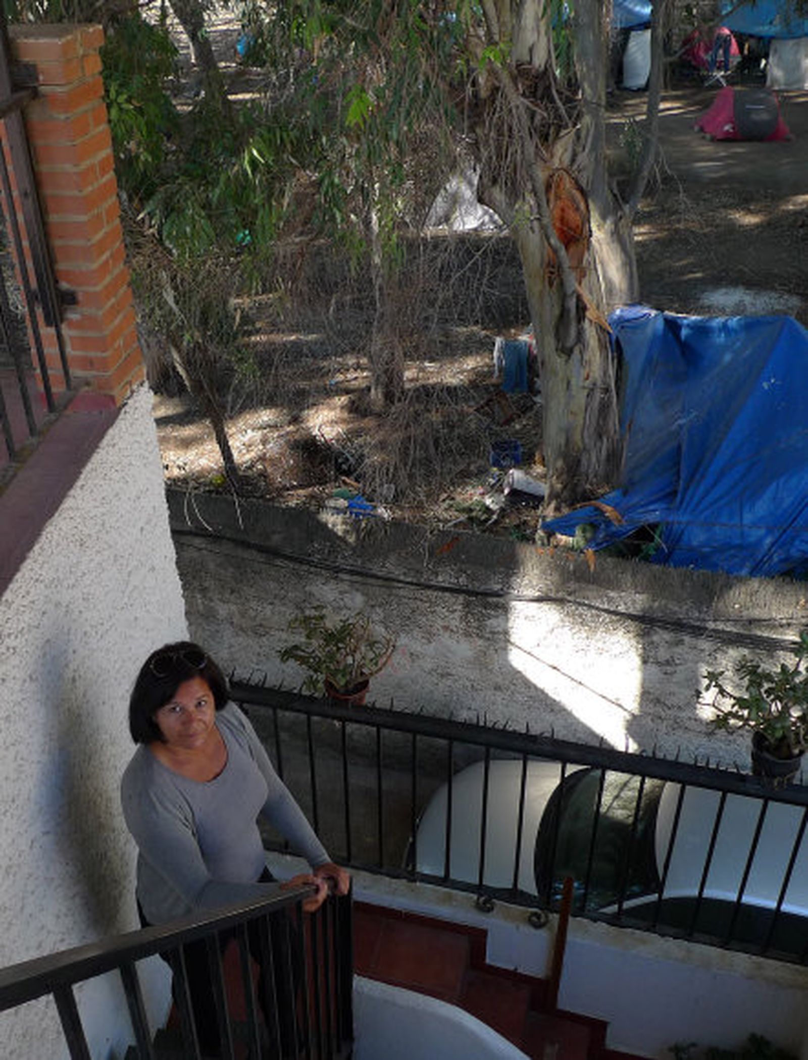 Uno de ellos es Isabel Ortega. Su vivienda y su terraza lindan con el campamento okupa. Cuando el redactor y el fotógrafo llegan a su terraza, desde donde se ve a un indigente asearse, lanza una exclamación: "Nuestros vecinos los okupas". María García y Gracia Marchena, otras dos vecinas, asienten con la cabeza. Acoso disfrazado de mendicidad, hogueras, ruidos, peleas, altercados con arma blanca, saqueo de contenedores son algunas de las situaciones que padecen casi a diario. "Desde mi terraza veo cómo hacen sus necesidades, van desnudos y lo peor es que la droga circula sin que nadie haga nada por evitarlo. No es normal la forma en la que estamos viviendo", se lamenta García.