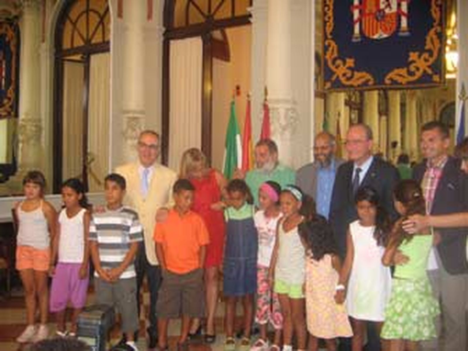 “Que seáis muy felices en Málaga”. Así se ha dirigido el alcalde, Francisco de la Torre, a una quincena de niños y niñas del pueblo saharaui que han sido recibidos por el primer edil en el Ayuntamiento de la capital. En total serán 159 los menores, de entre 8 y 12 años, que serán acogidos durante el mes de julio y agosto por familias malagueñas dentro del programa 'Vacaciones en Paz' organizado por la Federación Andaluza de Asociaciones Solidarias con el Sahara (FANDAS-Sahara) en colaboración con el Consistorio Malagueño, la Asociación Malagueña de Amigos del Pueblo Saharaui (AMAPS), la diputación y varios ayuntamientos de la provincia.