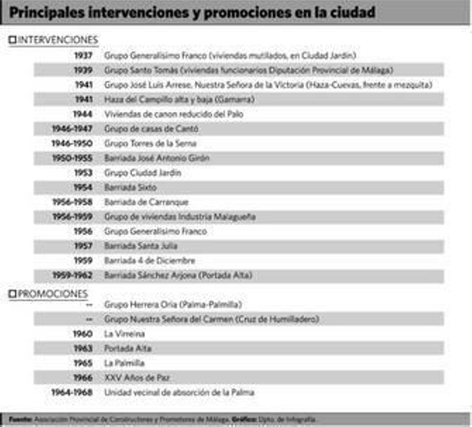El historiador explica que de 1937 a 1975, etapa que duró el régimen dictatorial en España, se construyeron en la capital un total de 23 proyectos urbanísticos que hoy todavía conservan símbolos franquistas. Éstos se reparten principalmente por los distritos de Carretera de Cádiz y Cruz de Humilladero, donde se concentran la mayor parte de las barriadas de nueva creación de la segunda mitad del pasado siglo XX. También hay algunos casos en Gamarra, El Palo y Palma-Palmilla. "Mención especial merece el caso de Olías, un barrio muy pequeño donde prácticamente no se ha eliminado ningún símbolo", añade Brenes.