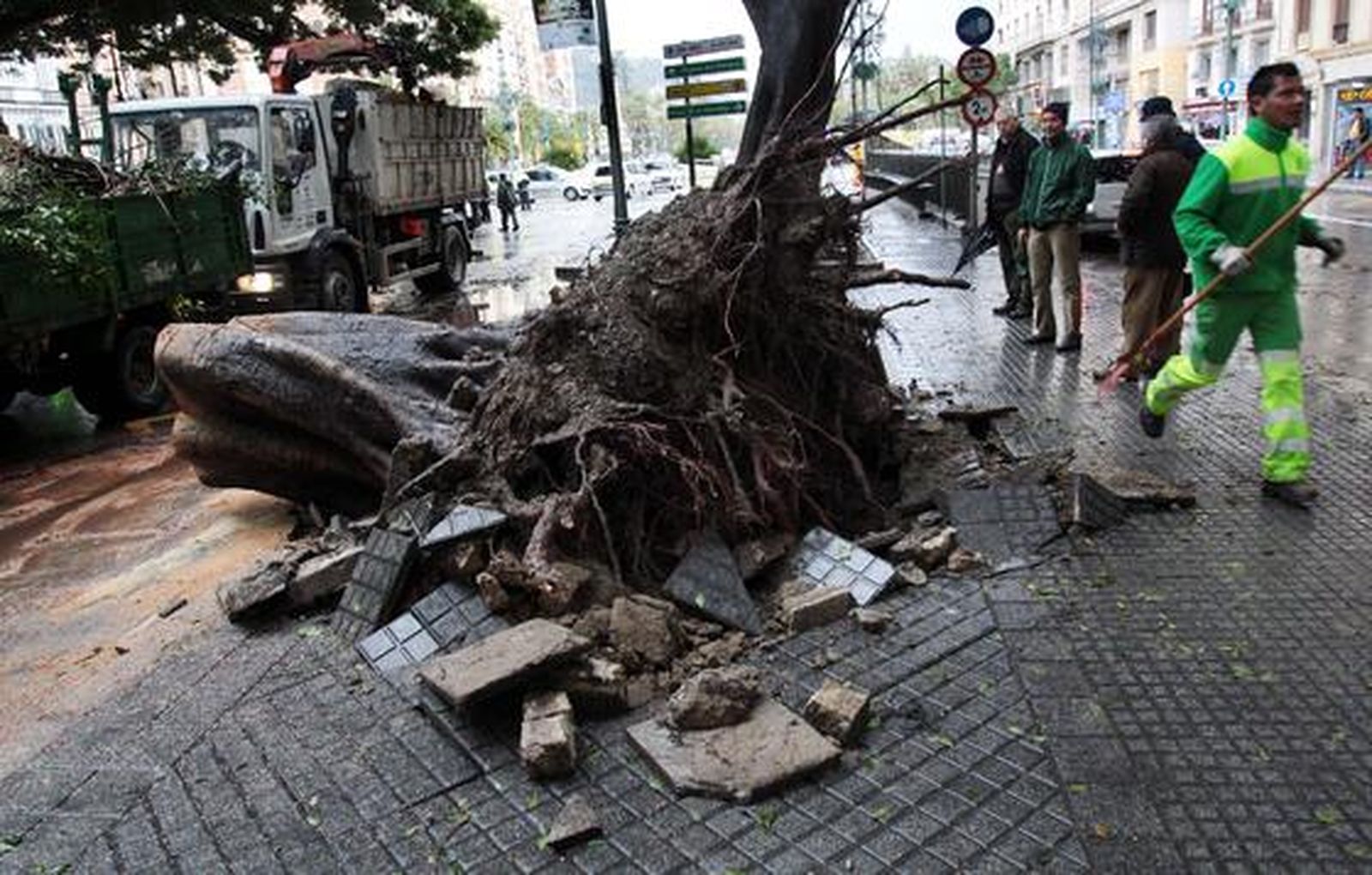 Las fuertes rachas de viento que azotaron el lunes a la capital malagueña, unido a los más de cien litros por metro cuadrado que cayeron durante todo el día, fueron más que suficiente para derribar uno de los ficus más grandes y antiguos de la Alameda Principal.