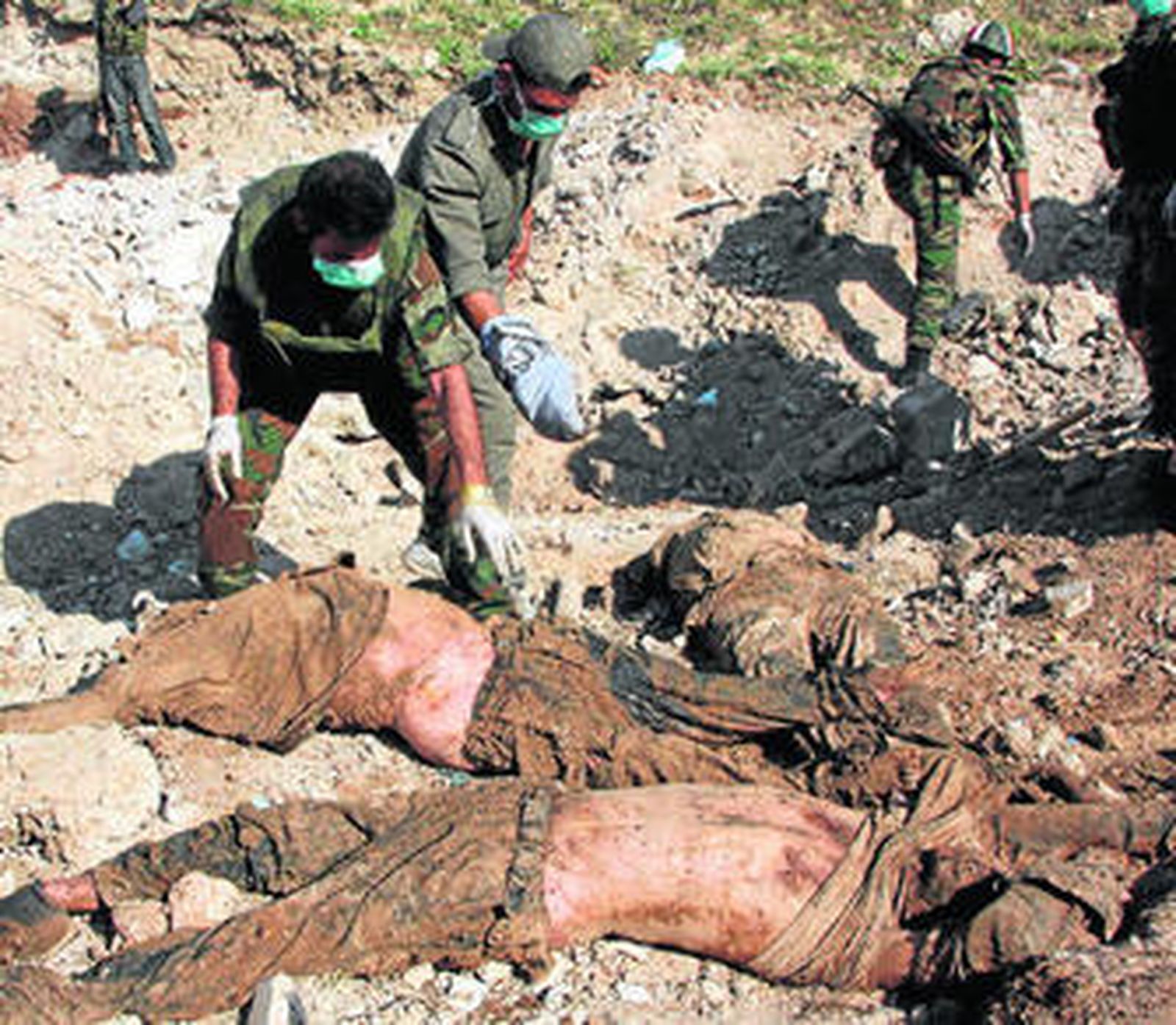 Soldados sirios revisan los cuerpos de diez policías torturados y enterrados en una fosa común.