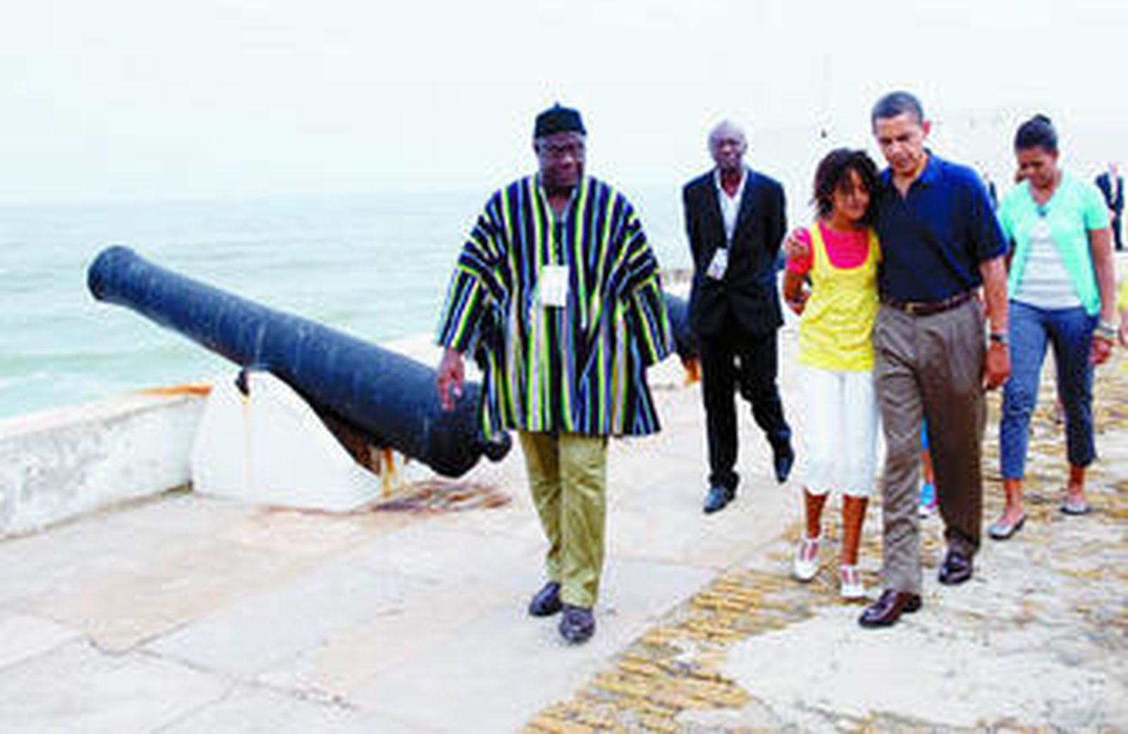 El viaje de Obama adquirió todavía más emoción cuando se desplazó junto a su esposa Michelle, Obama y su esposa, Michelle, que es descendiente de esclavos, y sus dos hijas, Malia y Sasha, al castillo de Cape Coast, antiguo centro de trata de esclavos, del que partieron miles de africanos con destino a Europa, América y el Caribe para un viaje sin retorno.