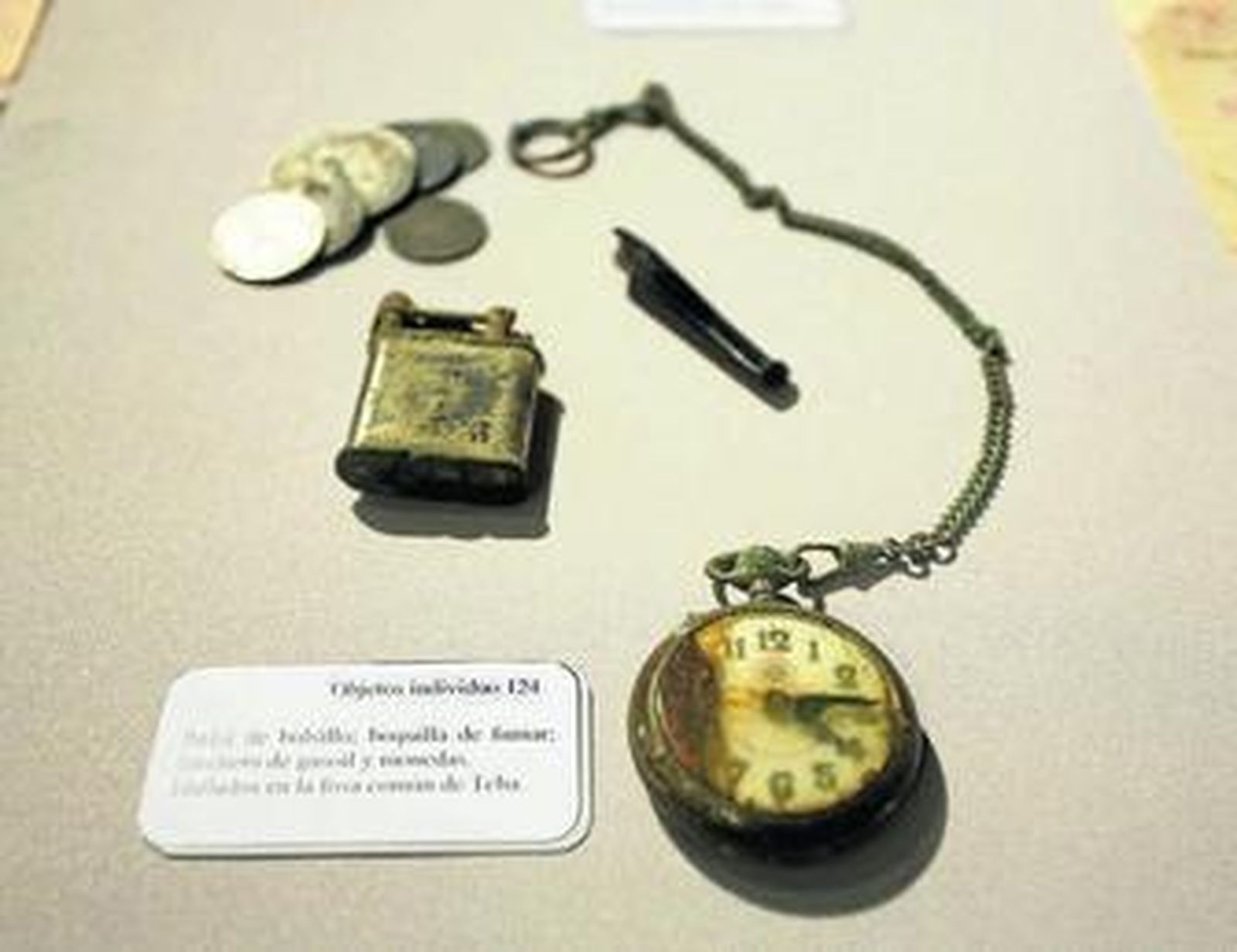 Su reloj se paró cuando marcaba exactamente las cuatro y cuarto. Estaba en su bolsillo, junto a unas cuantas monedas, un mechero de gasolina y una boquilla para fumar. Pertenecían al individuo 124 de la fosa común de Teba. En una zanja de 25 metros de largo por dos de ancho fue enterrado tras su fusilamiento. Y junto a él, 150 personas más acabaron ejecutadas desde el 15 de septiembre de 1936 hasta la fatídica noche del 23 de febrero del 37, cuando recibieron muerte más de 80 vecinos del pequeño municipio. Una exposición en el Archivo Histórico Provincial pretende recuperar el pasado y con él la dignidad de las víctimas y sus familias.